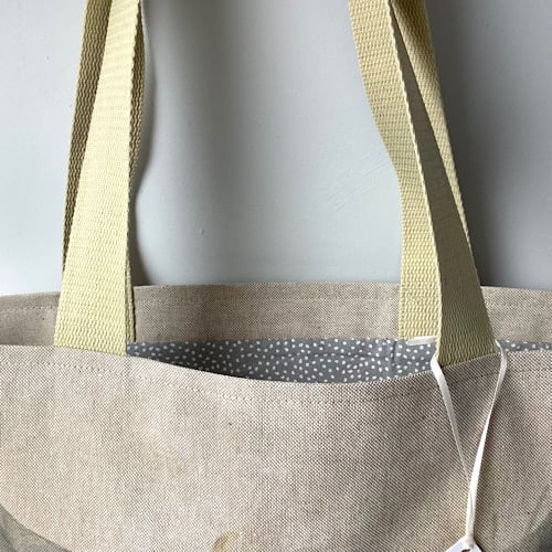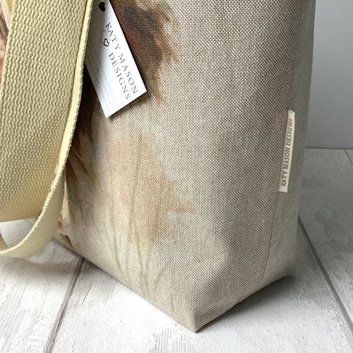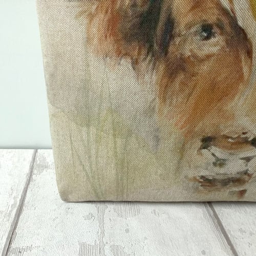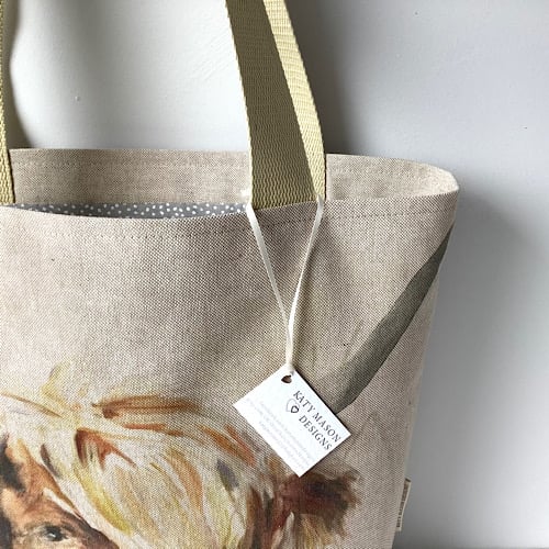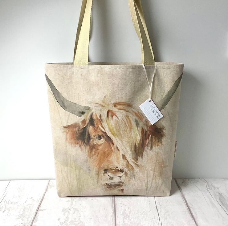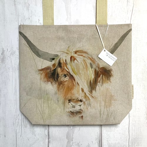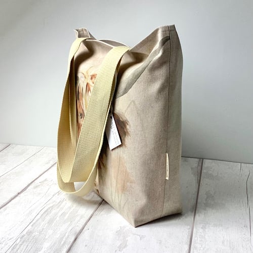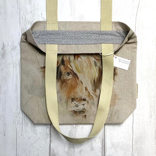 Long handled tote bag in a beautiful Highland Cow print fabric. Fully lined in grey spot fabric with an inside pocket and webbing handles. 35cm wide, 38cm high, 12cm deep.