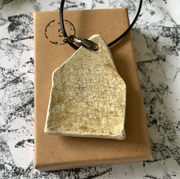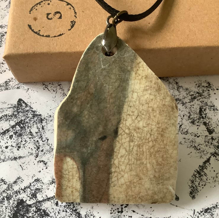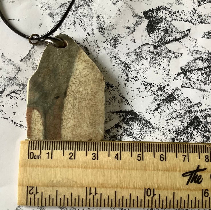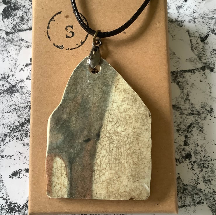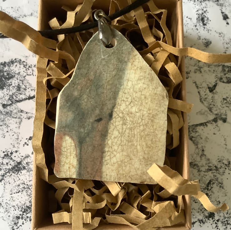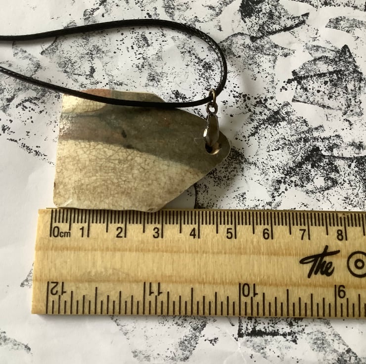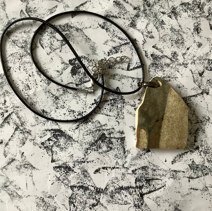 For me the shard naturally feels perfect for a pendant. Turning it from its side where I believe the pattern runs around with the curve to an upright position I can see in the abstract pattern a sense of a house. I only sanded, sealed the rough edges and drilled a hole. I prefer to use pieces as found but thoroughly clean them.
