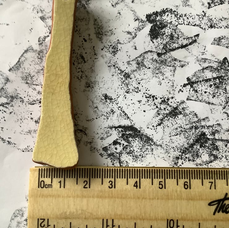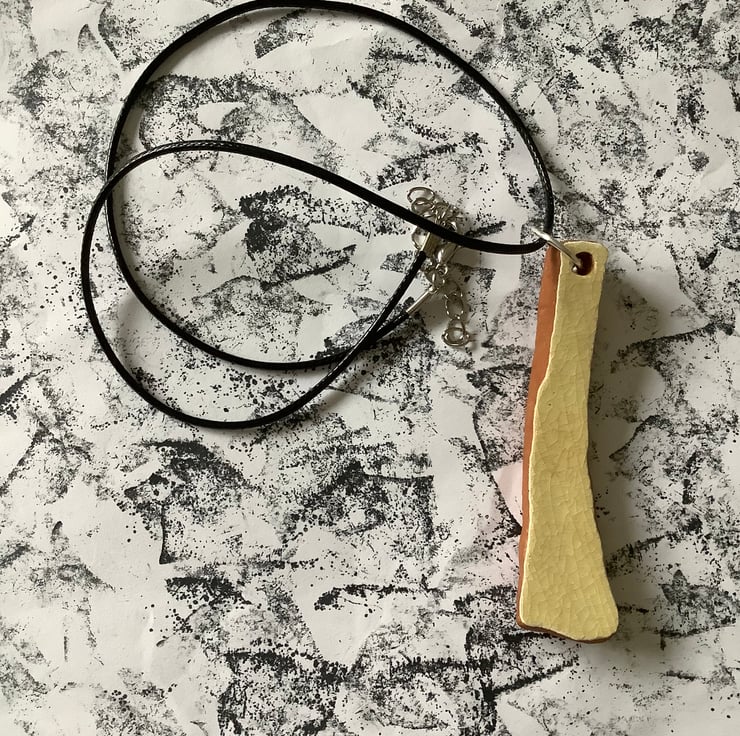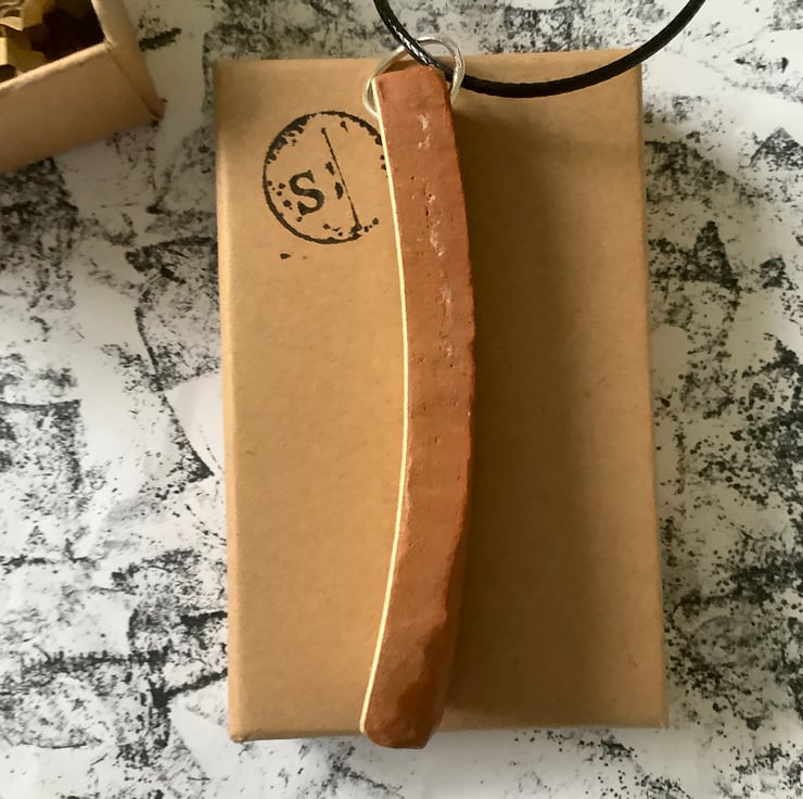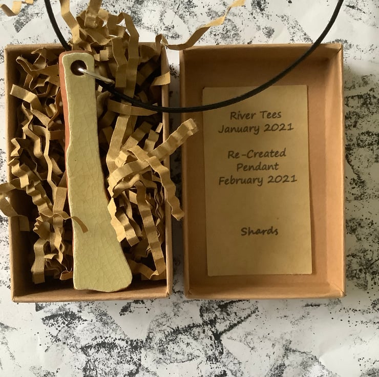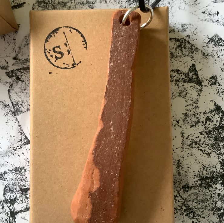 In January 2021 I found this wonderful long piece of pot with several other bits in a stream leading into the river Tees, Abbey Road, Barnard Castle. Red pot with cream crackled glaze, curved, elongated. Theres a lot of red pot with cream glaze living in the rivers, all sorts of shapes and sizes but this is the first long piece I’ve found, the shape is exactly as I found it, I only sanded, sealed the rough edges and drilled a hole.