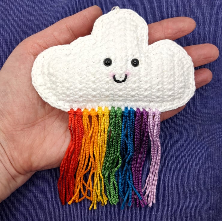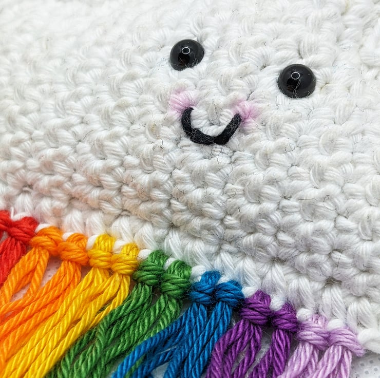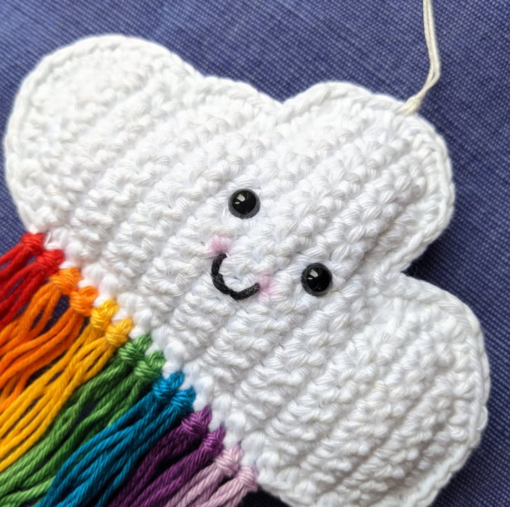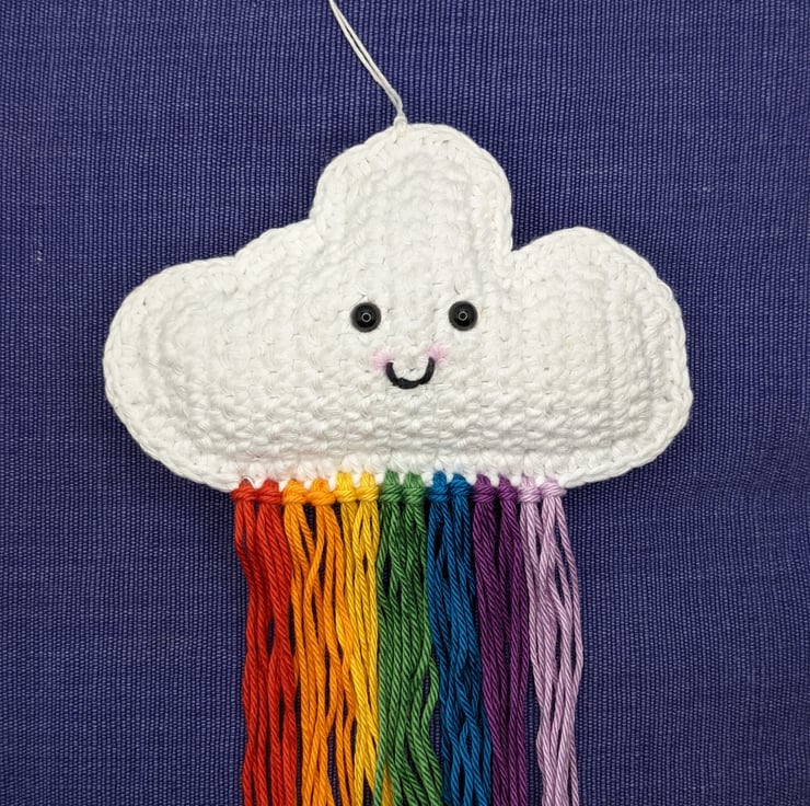 Crochet cloud hanging decoration with rainbow tassels.