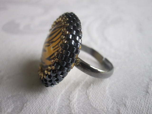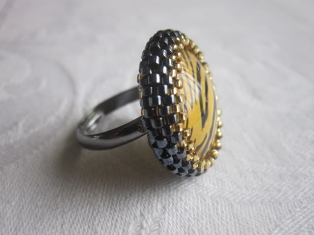 This beadwork ring is made using Japanese delica and seed beads in both gold and black along with a cabochon in a gold and black animal print design. It has a diameter of approx. 2.3cm. The adjustable black coloured ring base has an inside diameter of approx. 1.8cm. This ring will come in a gift box as shown in the photo's.