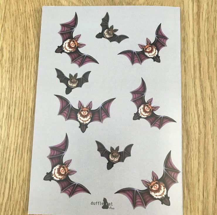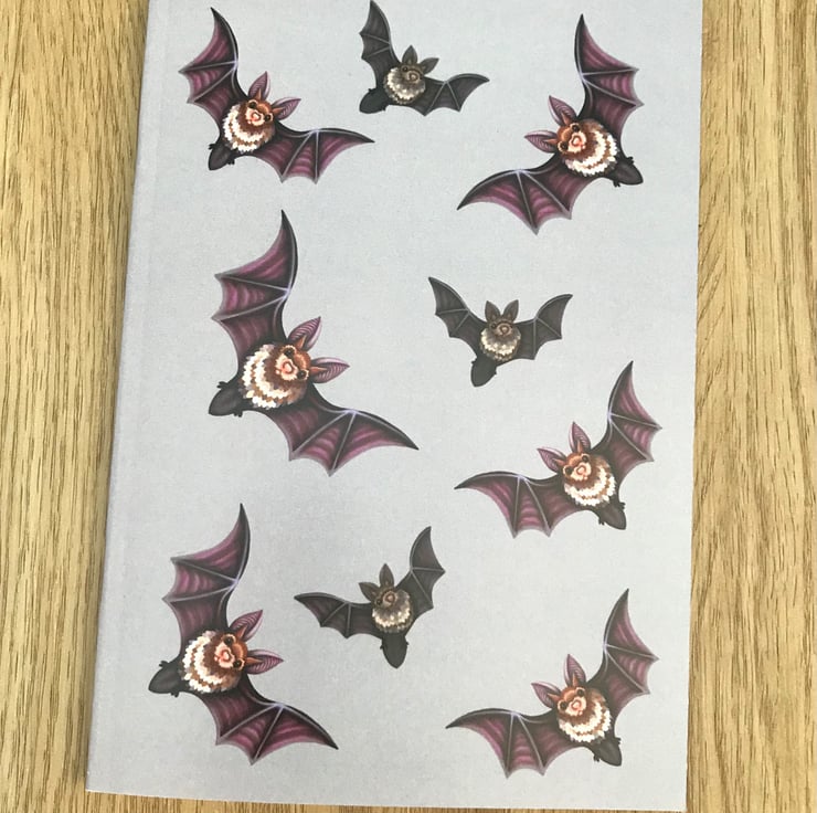 A 48-page A6 notebook with full colour printed outside covers. Inside covers are blank. Printed on 300gsm white recycled paper and pages are lined. 21 cm x 14.8 cm. Design is the same on the back with a small DuffleCat logo.