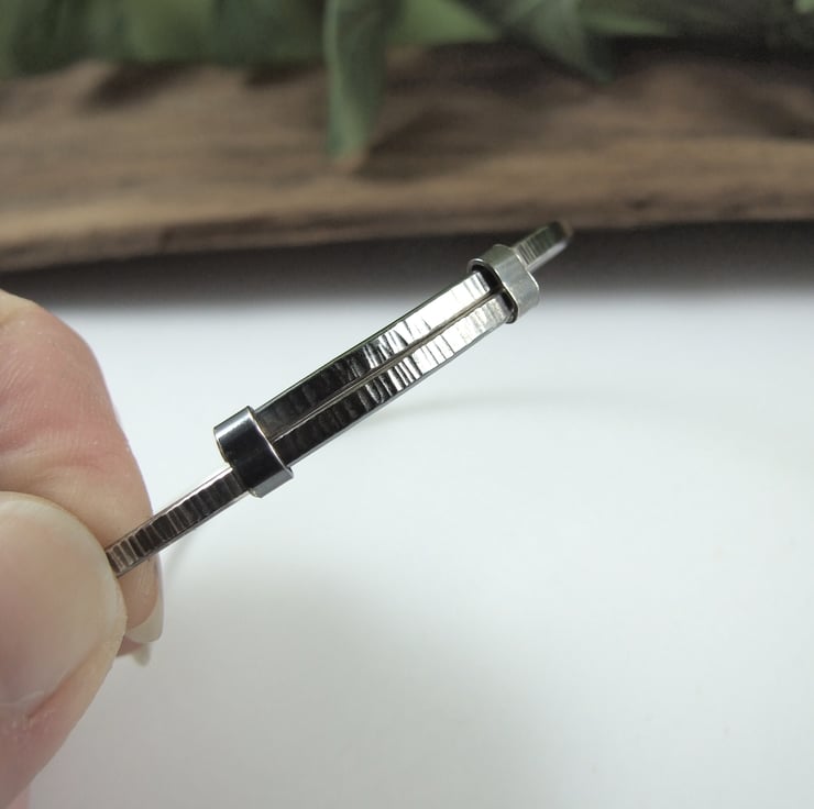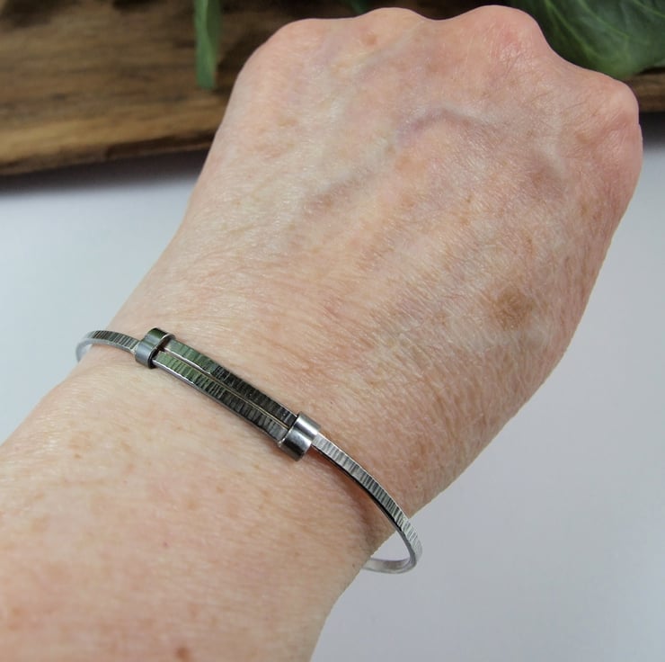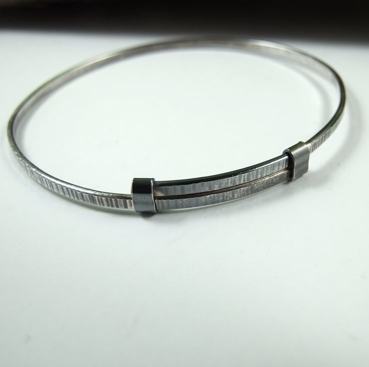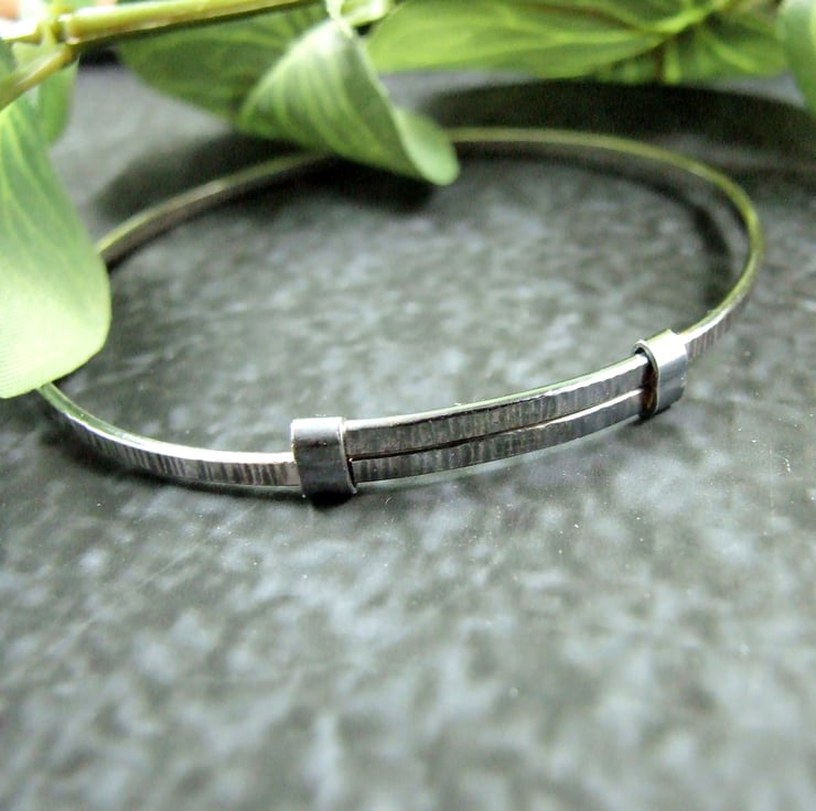 I have made the bangle from 2mm wide sterling silver wire, which I have run through my rolling mill to flatten to 1.2mm thick and textured with a hammer. I then solderd in place two sliders overlapping to create an adjustable fit and given it a bright polished finish.