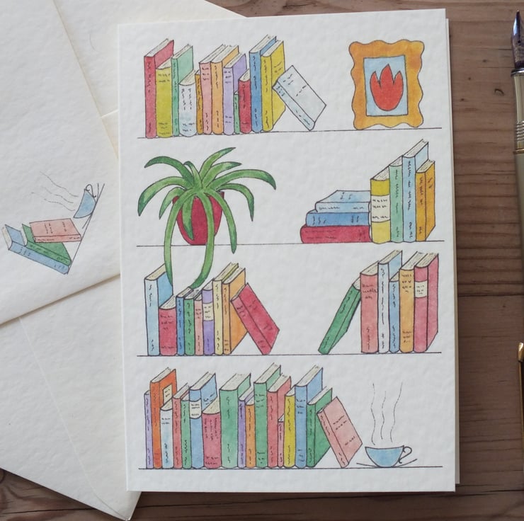 The shelves of books on this card are printed from my original watercolour painting. The ivory cardstock has a hammered finish, giving a feeling of quality which is lovely when writing and receiving cards. The envelope has a small section of the painting printed on the flap – much more interesting than a plain envelope.
