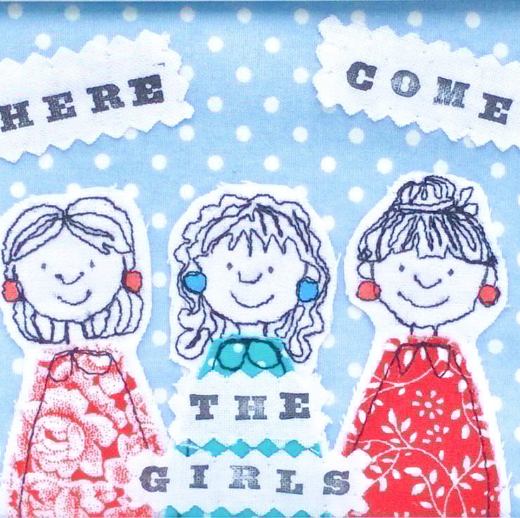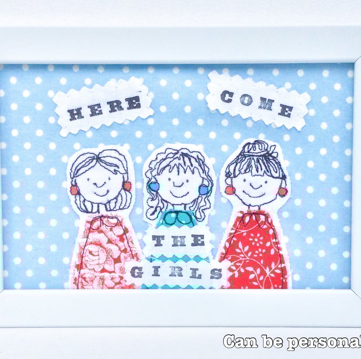 This fun design has been made using appliqued fabrics and freemotion embroidery. Liberty print fabrics and embroidered little people with a cheeky slogan make for a cheerful gift. This design can be customised with your colour choice of fabrics. Please feel free to contact me to discuss any details you would like including in this design eg hairstyles, clothing, earrings and glasses.