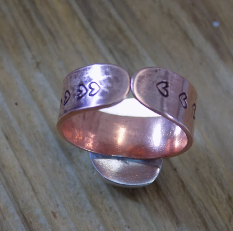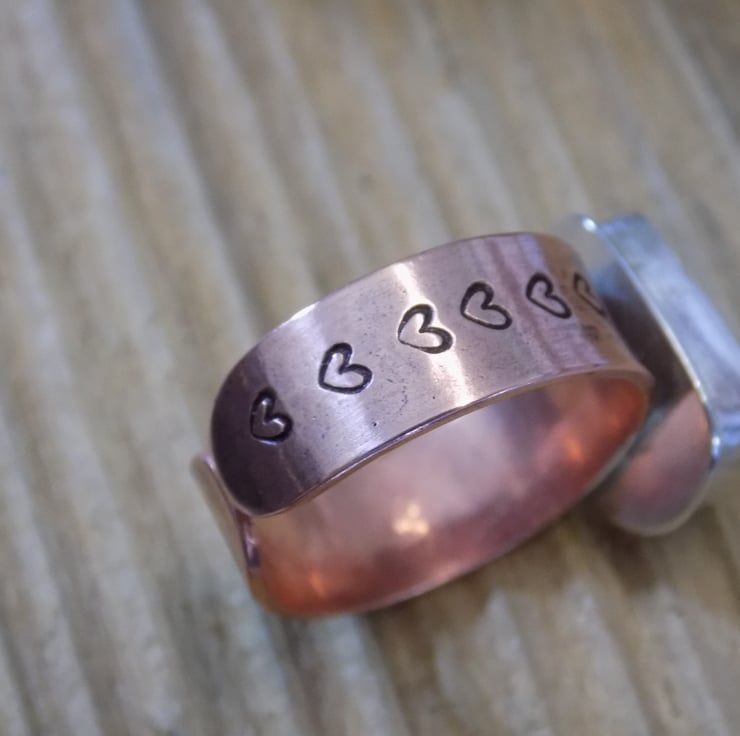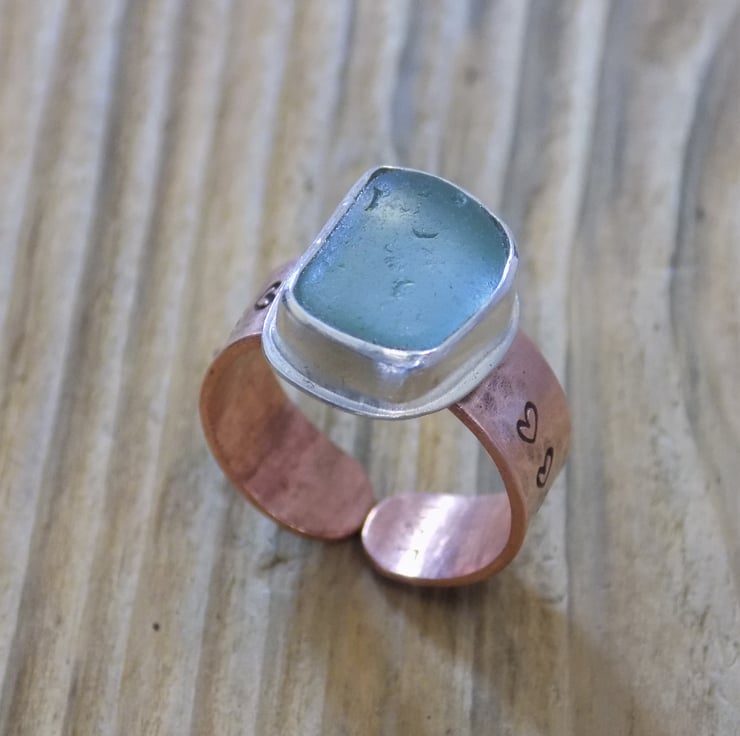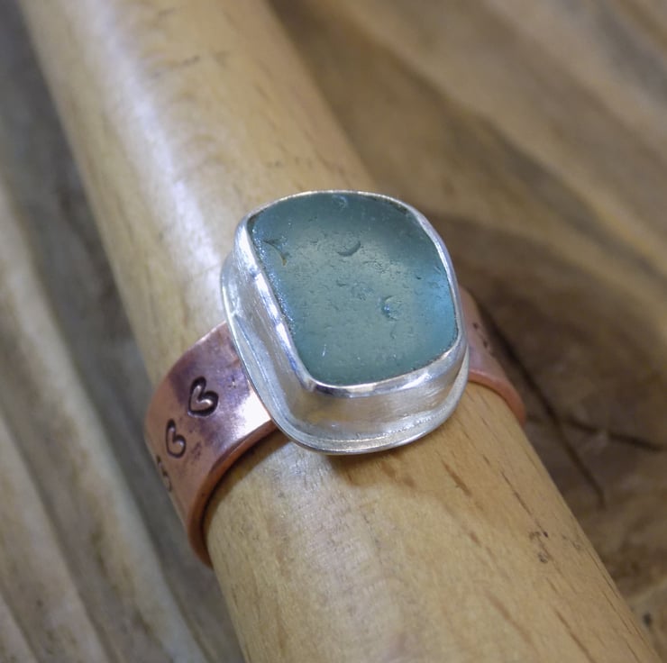 Made from sterling silver, copper and sea glass. I have set a piece of sea foam sea glass in a custom made bezel using traditional silversmithing techniques. The band is made from copper sheet and is 7mm wide and stamped with tiny hearts around the shank. Set to a UK size O but will adjust slightly.