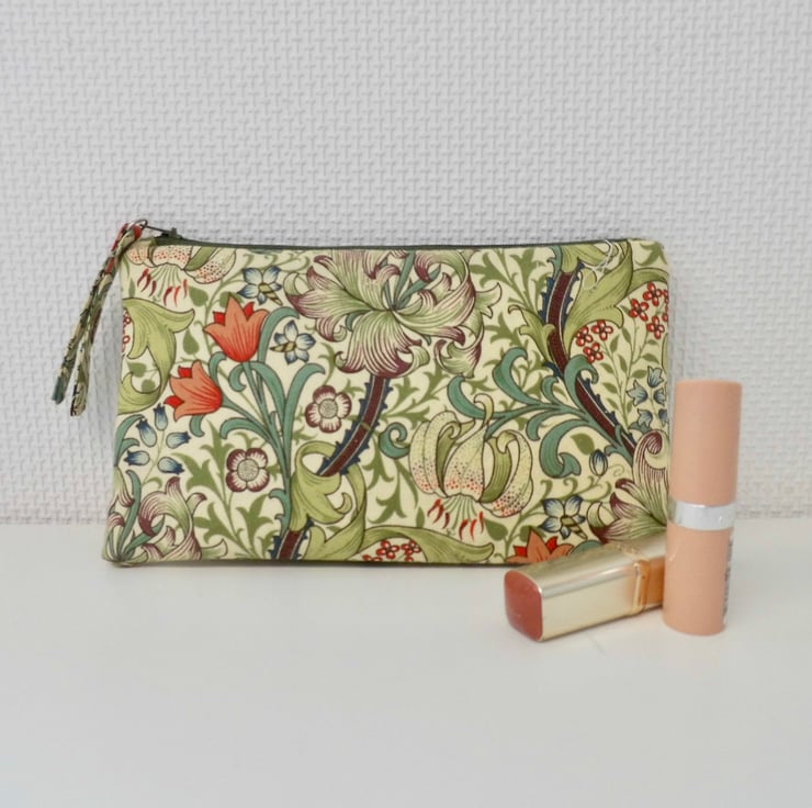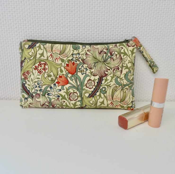 This make up bag is made with a quality quilting cotton printed with William Morris's iconic Golden Lily design. The main colours are cream, greens and reds and it features English county blooms winding through tangled briar leaves. This outer fabric has been backed with fusible fleece to give it extra body and a quality feel. There is a contrasting lining in dark green shower-resistant cotton and there are no raw edges on the inside.