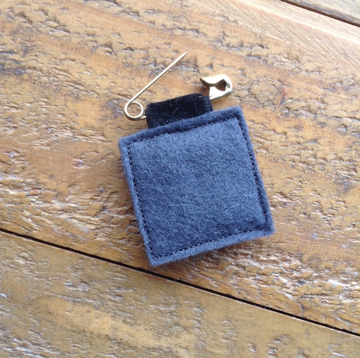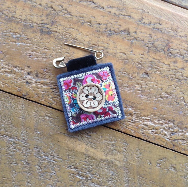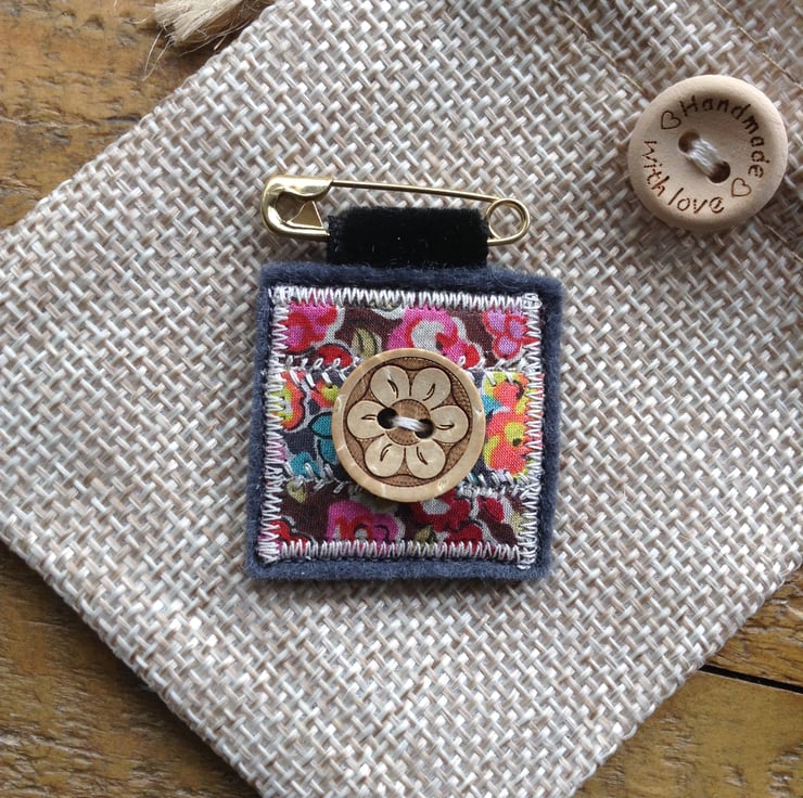 I have sewn 2 small pieces of Liberty fabric onto wool felt with machine embroidery and added a carved coconut shell button.