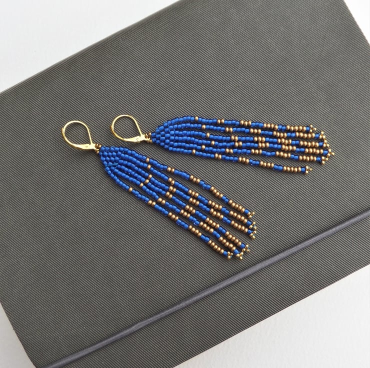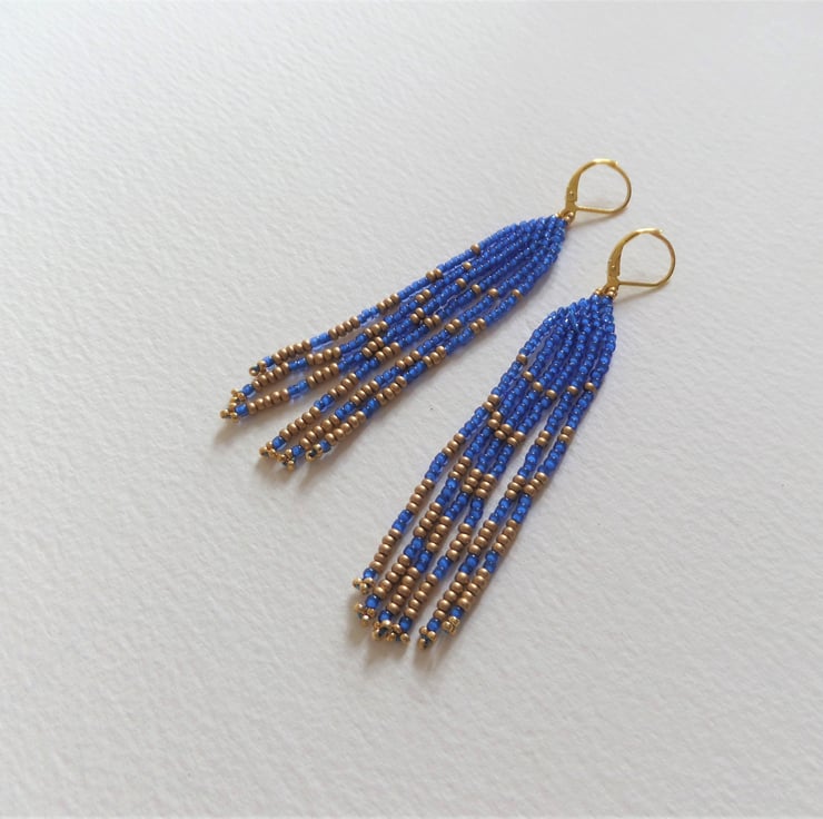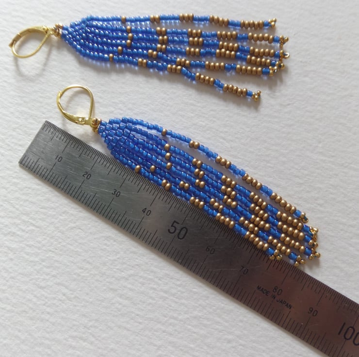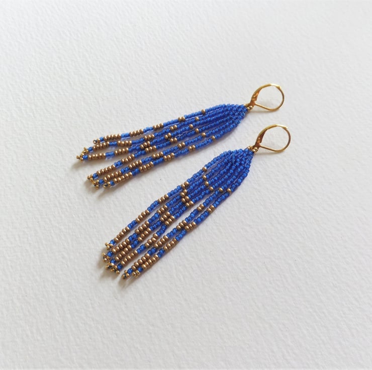 These are part of my American Indian inspired range of fringed earrings. In stunningly beautiful bright Capri blue and matt gold seed beads.