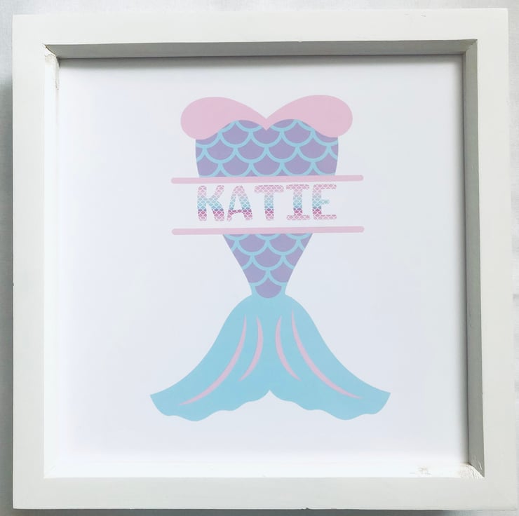Personalised Mermaid picture in a white square frame with Perspex rather than glass - safer for young ones. Frame size approximately 24cmx24cm. Choice of colour.