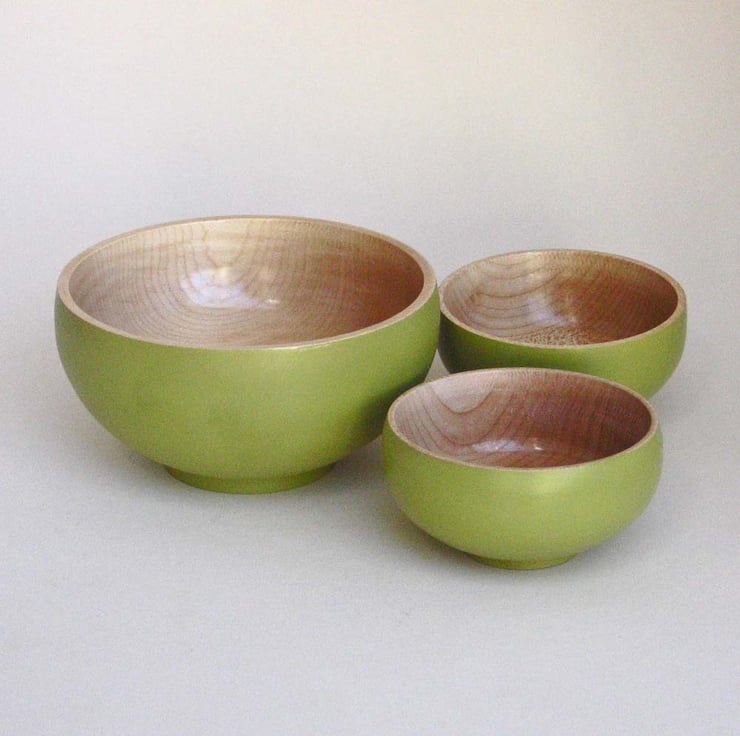 A simple, colourful but exquisite set of bowls turned in sycamore. The inside of the bowl has been lacquered to give a durable water resistant and food safe finish. Externally they have been painted in a matte satin finish and again lacquered for durability. They would be suitable for tapas and snacks, or just as an ornamental pieces. This set is green but they are available in other colours.