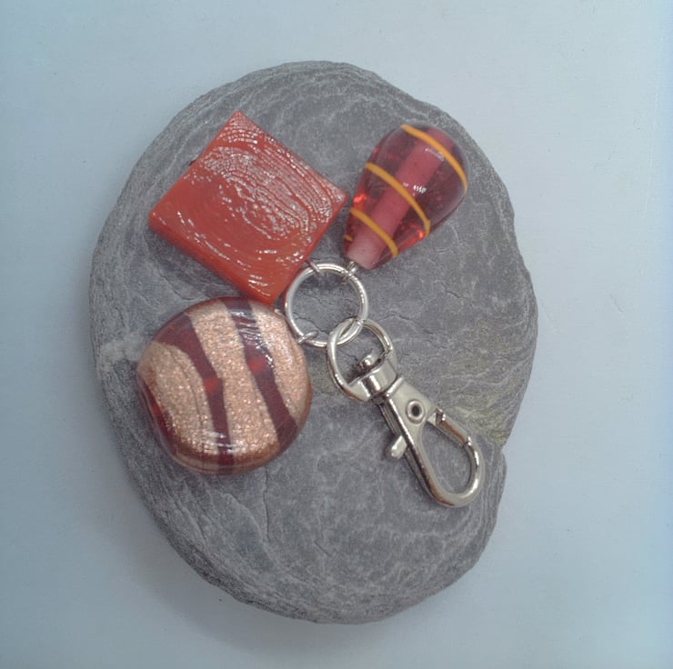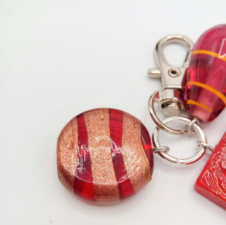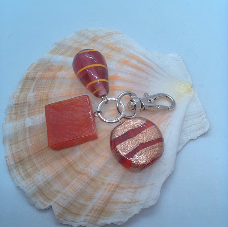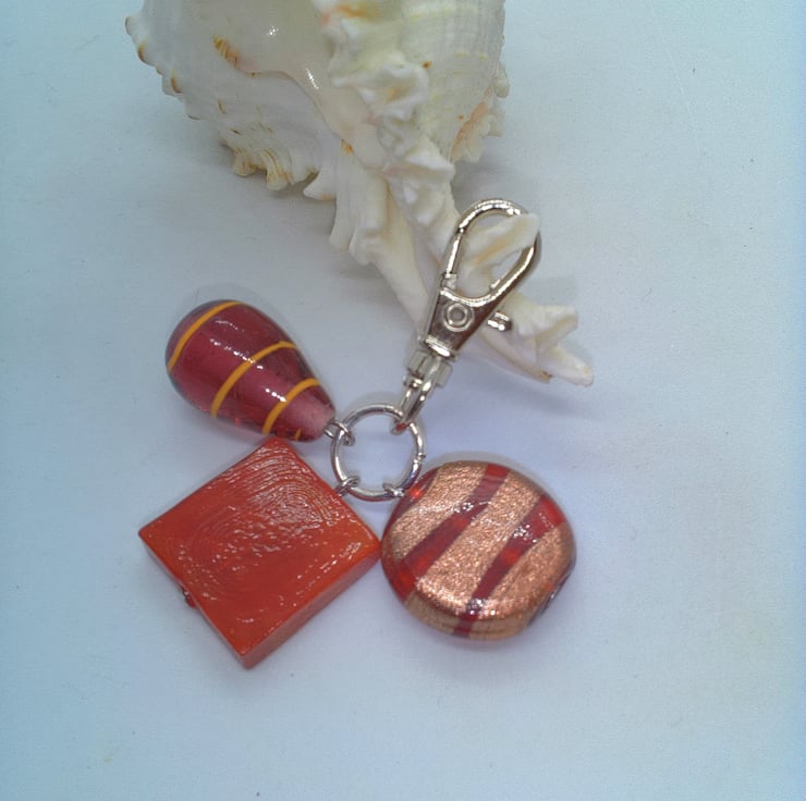 This fun and practical silver plated Bag Charm would make an ideal gift for a friend or relative, a treat for yourself, or for a Thank You Gift. The Hand Bag Charm Clip is silver plated and has a red square bead, 20 mm x 20 mm, a red and gold round bead, 20 mm and a fuchsia pink teardrop glass bead, 25 mm x 15 mm. The overall drop of the charms is 35 mm, from the bottom of the swivel clasp to the bottom of the charms. The bag charm will be dispatched wrapped in tissue paper in an organza bag and delivered to you via Royal Mail first class post.