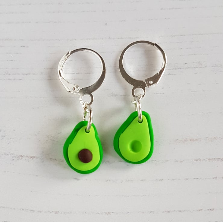 These bright green avocado earrings have been carefully hand crafted using polymer clay, complete with tiny brown stone and dark green surround.