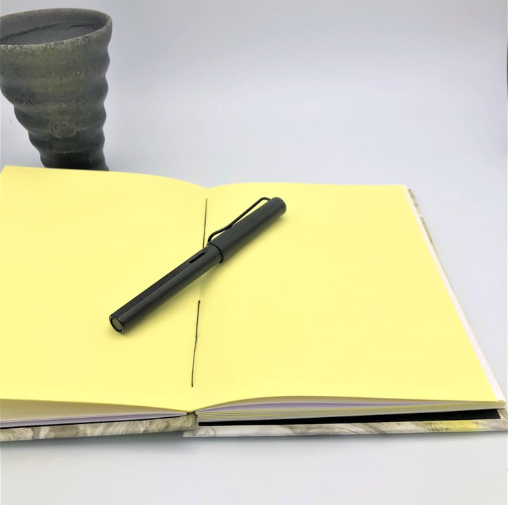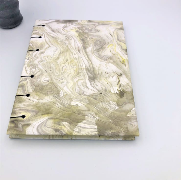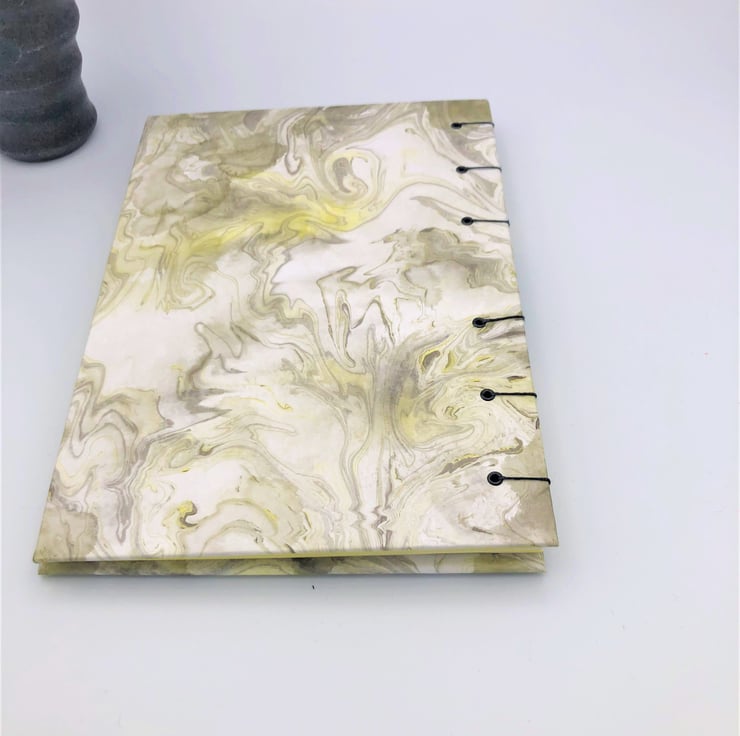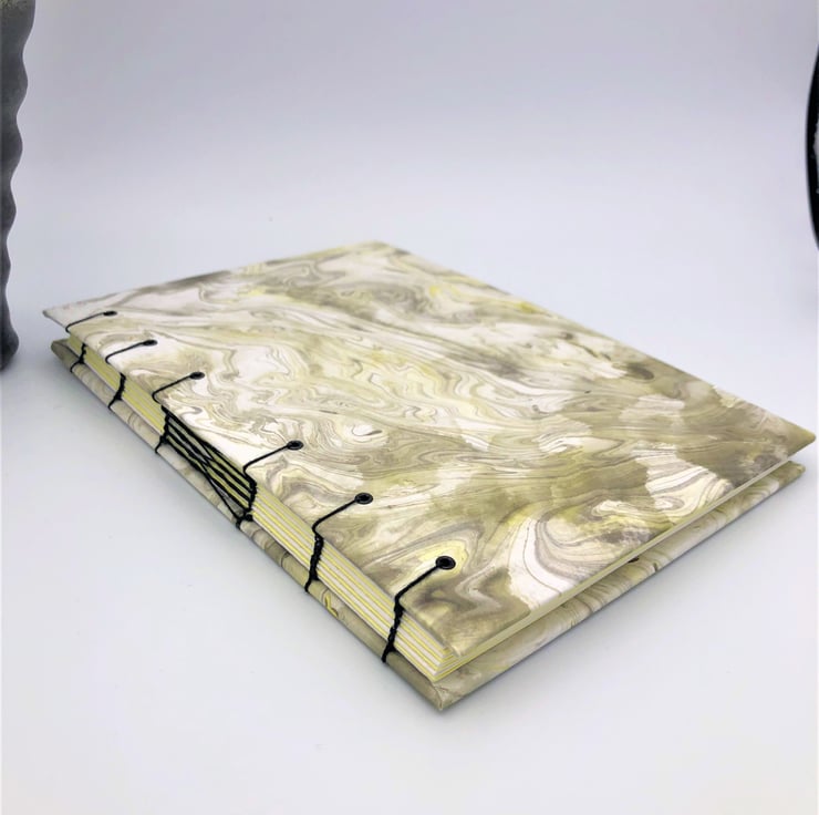An A5, sketch book, made with a unique combination of French chain and coptic stich binding and hand marbled paper in shades of grey with yellow highlights for the cover. The pages are alternating signatures in yellow and white.