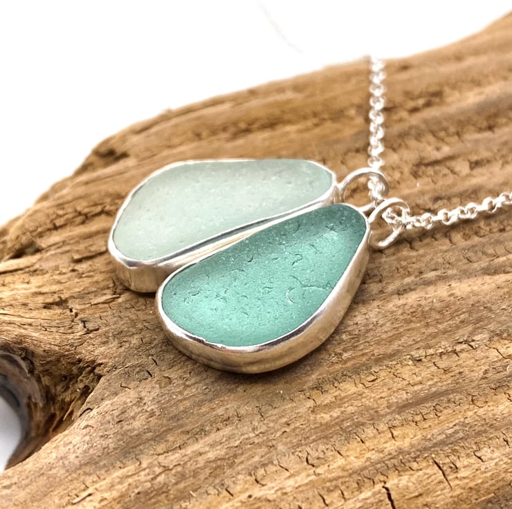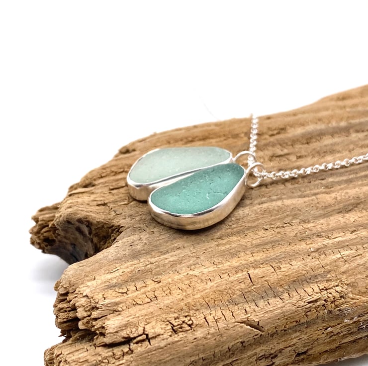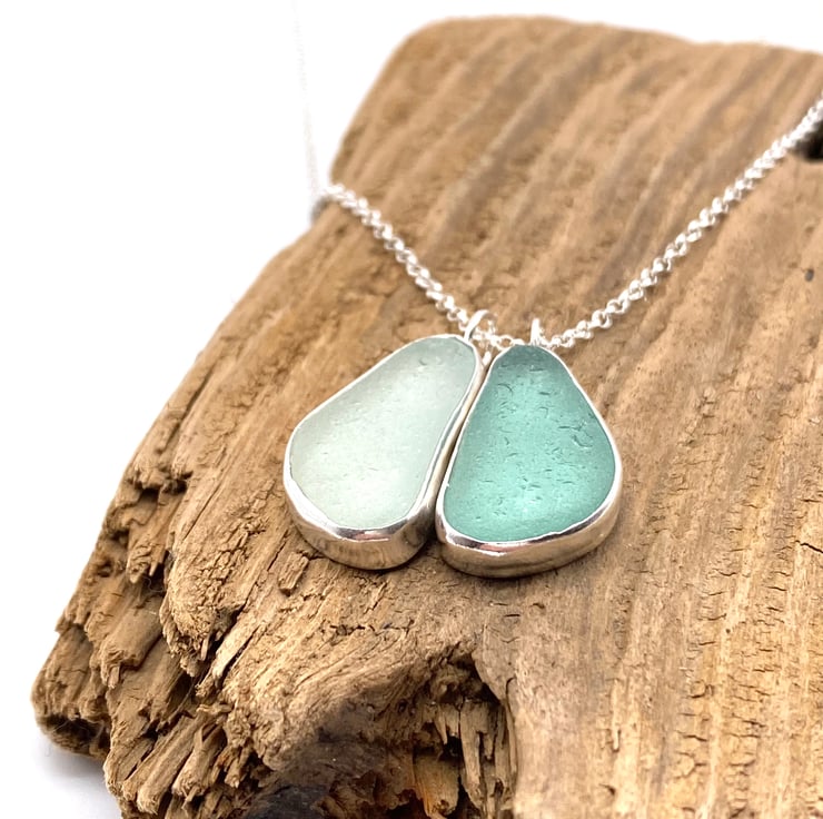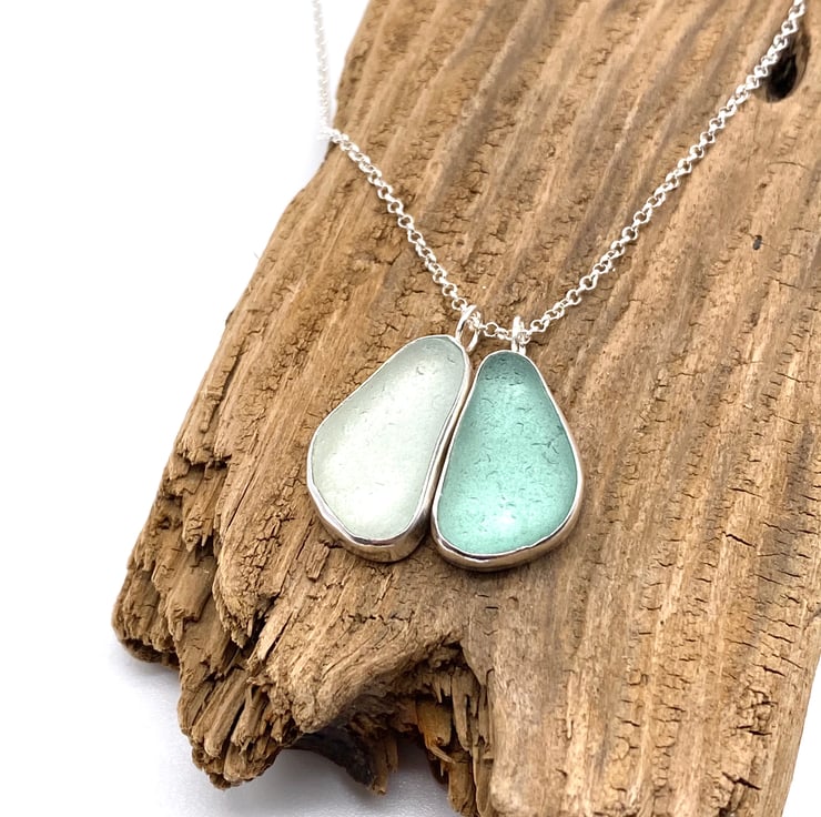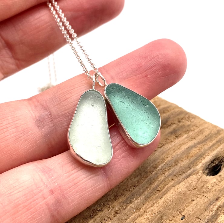 Double cluster sea glass necklace. Pendants have been hung on an 18” sterling silver belcher chain.