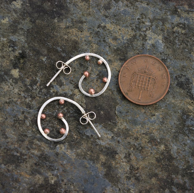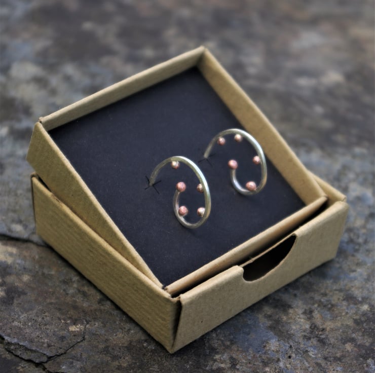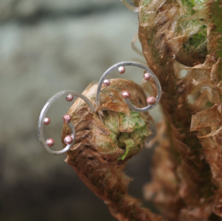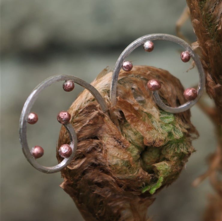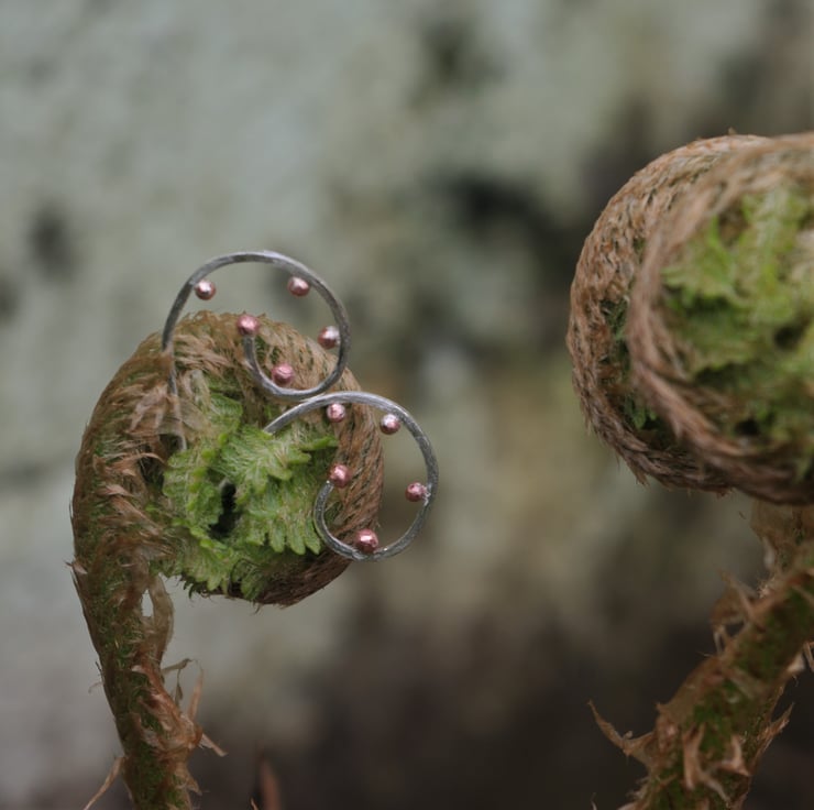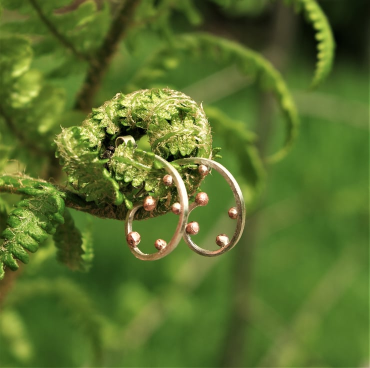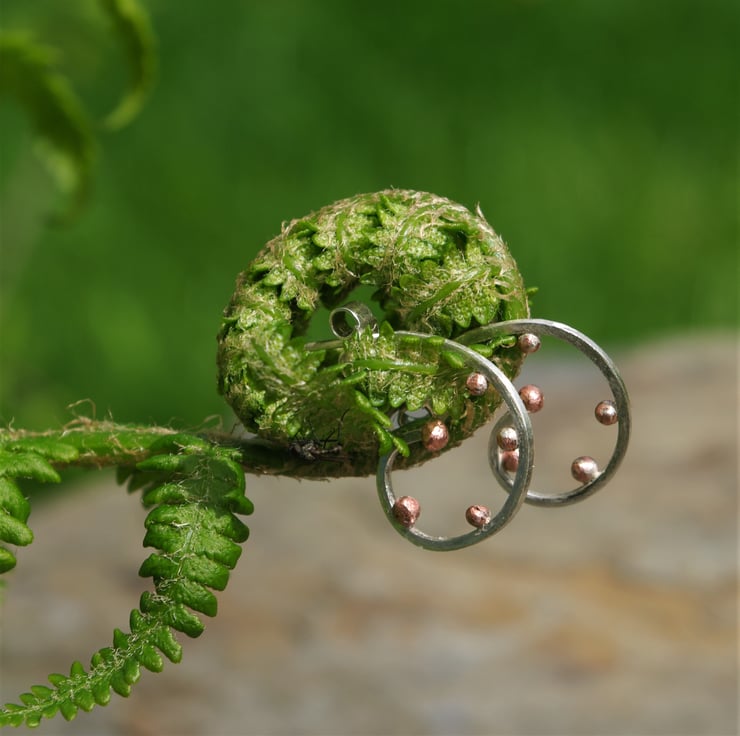 Silver wire in a circular open hoop, inspired by unfurling ferns; made with eco sourced square sterling silver wire to which are soldered small recycled copper balls , inspired by fern leaf buds In the natural state, copper makes a good contrast with the colour of the silver.