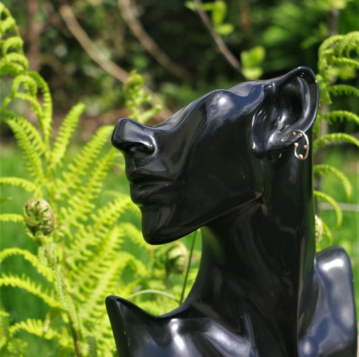They are fastened to the ear with sterling silver stud ear posts and scroll backs . They are designed to curve round at right angles to the ear, so that the last copper bud just touches the bottom edge of an average sized earlobe