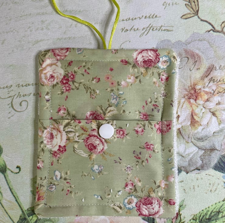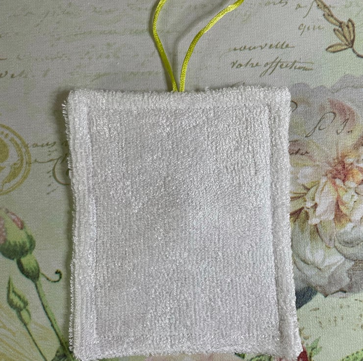 Back overlapping cotton with a plastic popper, to keep your soap safe. Front white Bamboo Terry Towelling. Just soak the mitt and the soap will lather up. Wash in a cool wash, light iron on the cotton side and ready to go again. A handy cord for hanging.