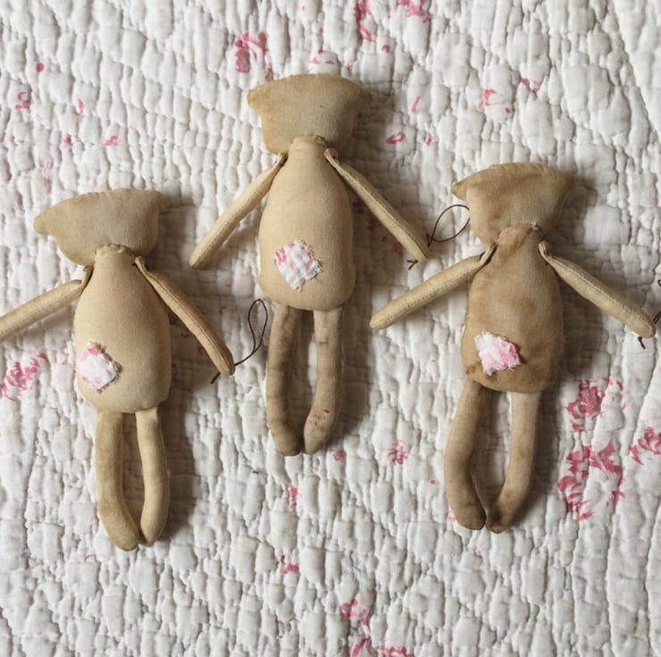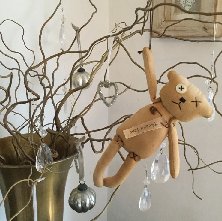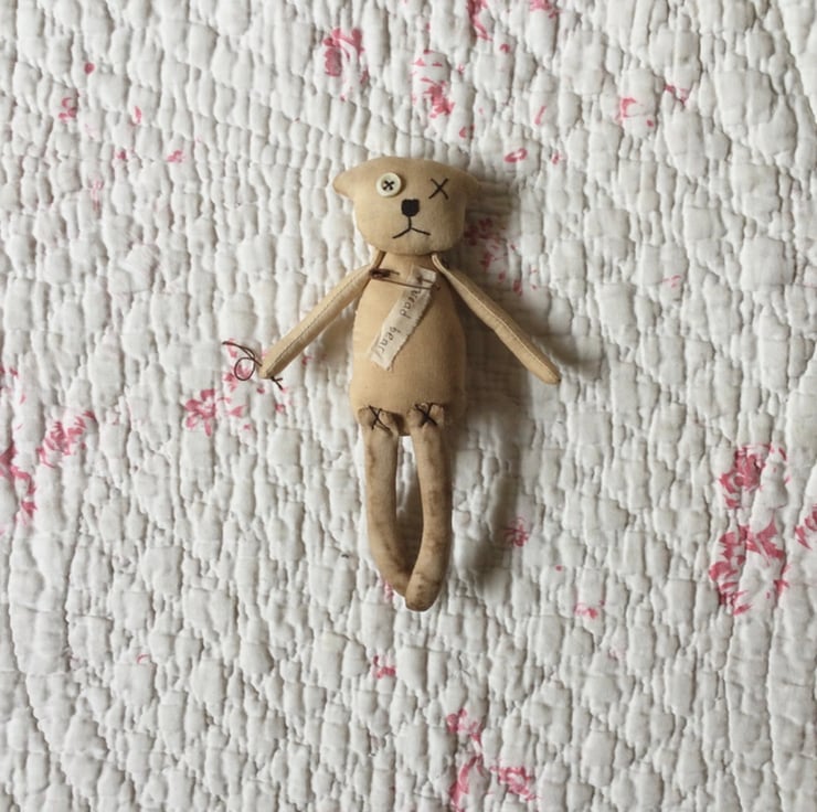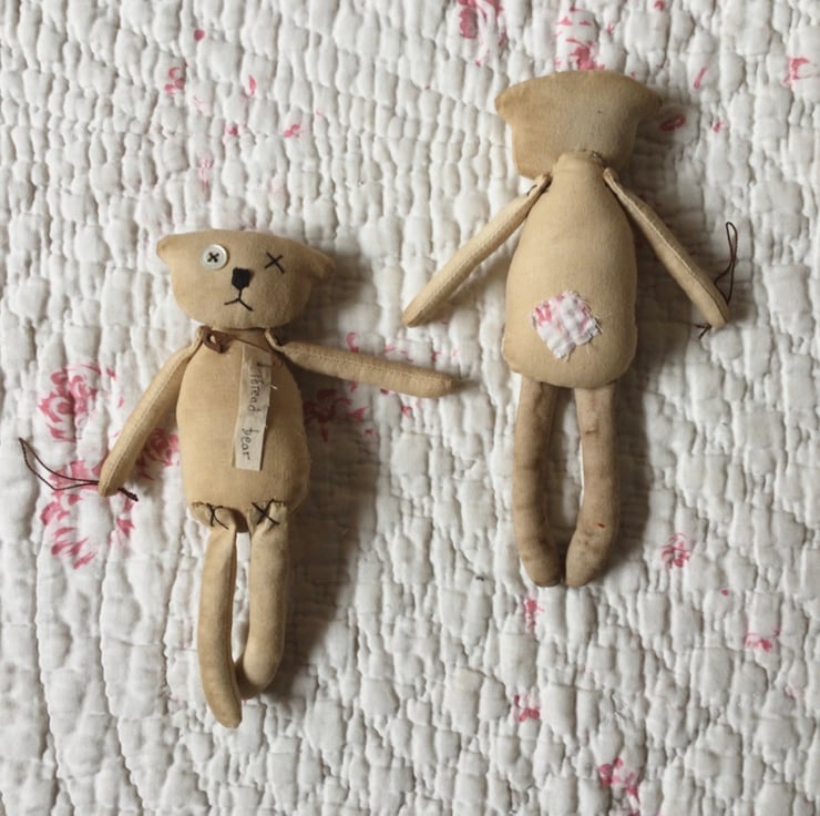 Each bear is made from tea/coffee stained cotton to give them an aged appearance. The limbs are attached with X-stitch and the facial features, with one pearl button, are also hand stitched.