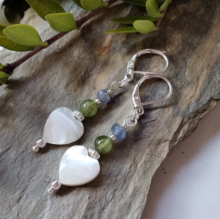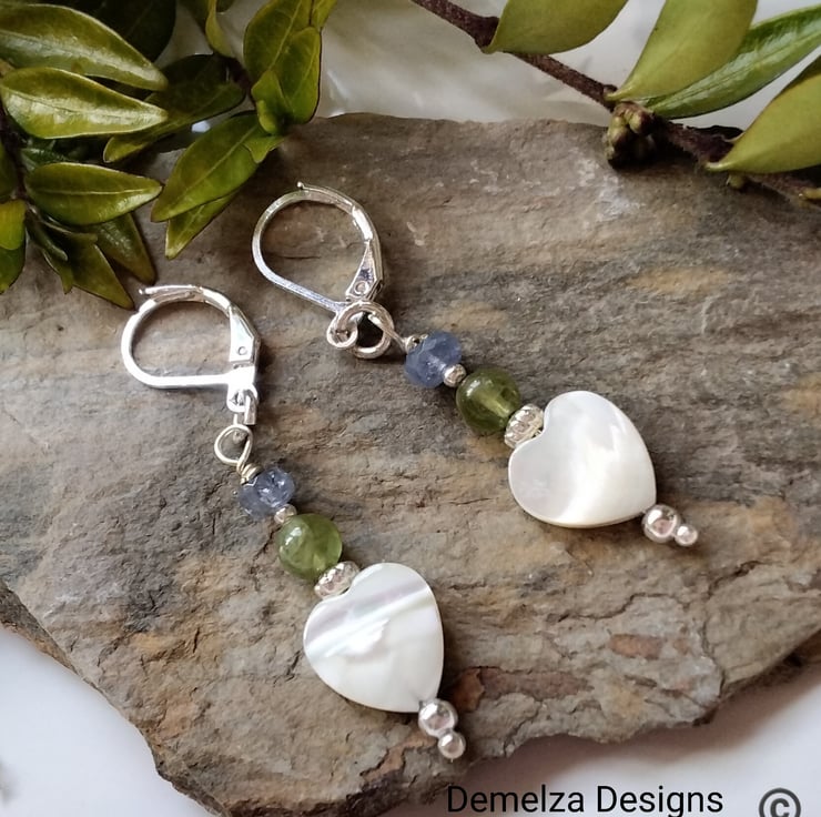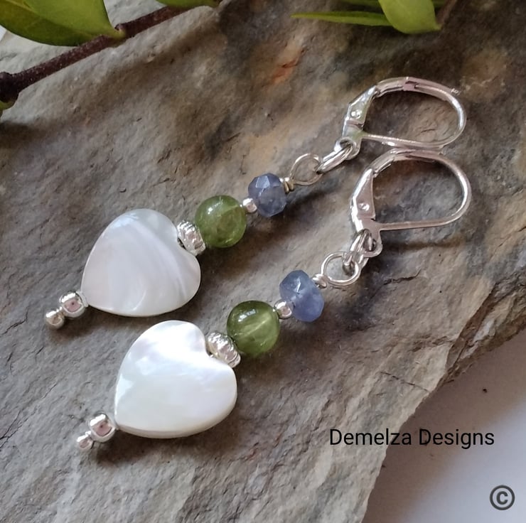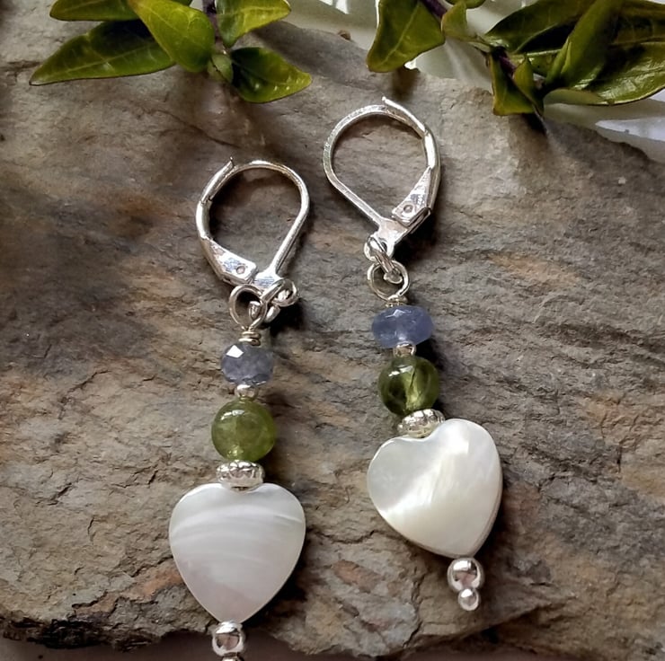 A beautiful feminine pair of earrings designed and hand crafted using genuine natural free cut heart shaped mother of pearl complimented with 4mm faceted tanzanite rondelles and 5mm peridot round gemstones. All other components used are qiuality silver plate. The lever backs are sturdy and will not loose their shape whilst applying to the ears, unlike some flimsy lever backs available!
