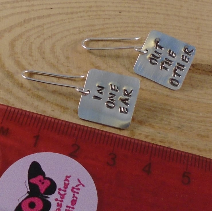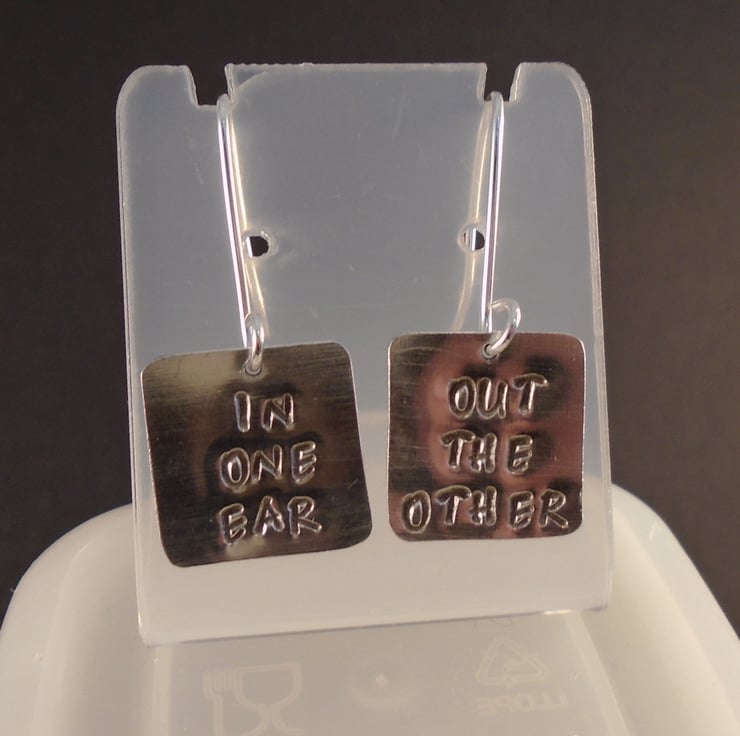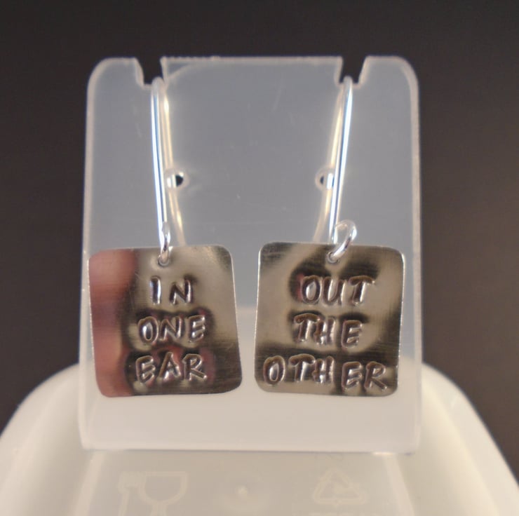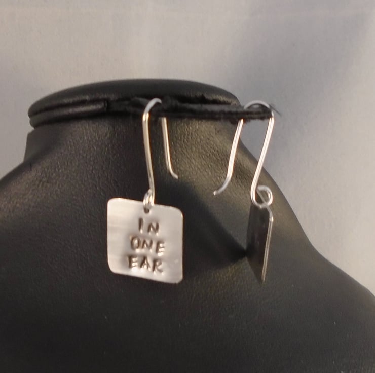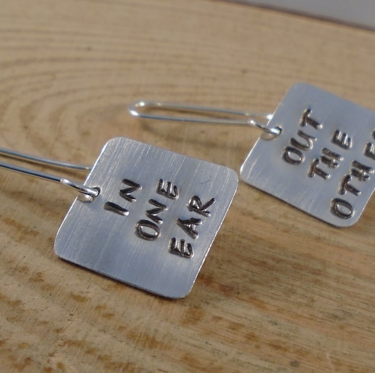 A quirky and funny pair of earrings, hand made from sterling silver. Two squares have been hand pierced from a sheet of silver. The have then been hand stamped with the words 'In One Ear' and 'Out The Other.' A hole has then been drilled in the top so they can be attached to hand made sterling silver ear wires, and oxidised to blacken the stamped wording.