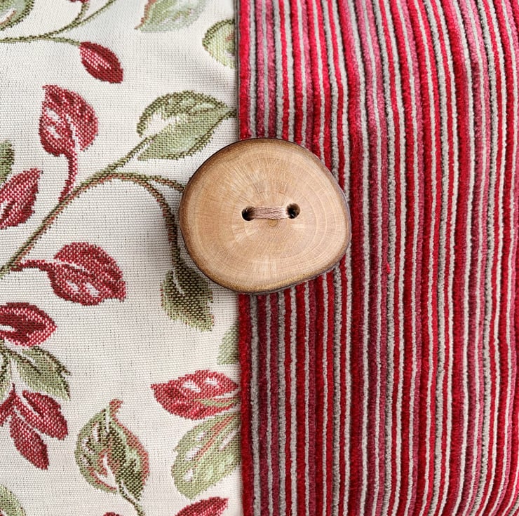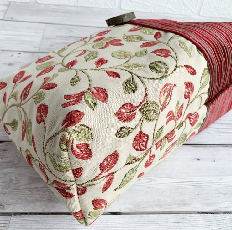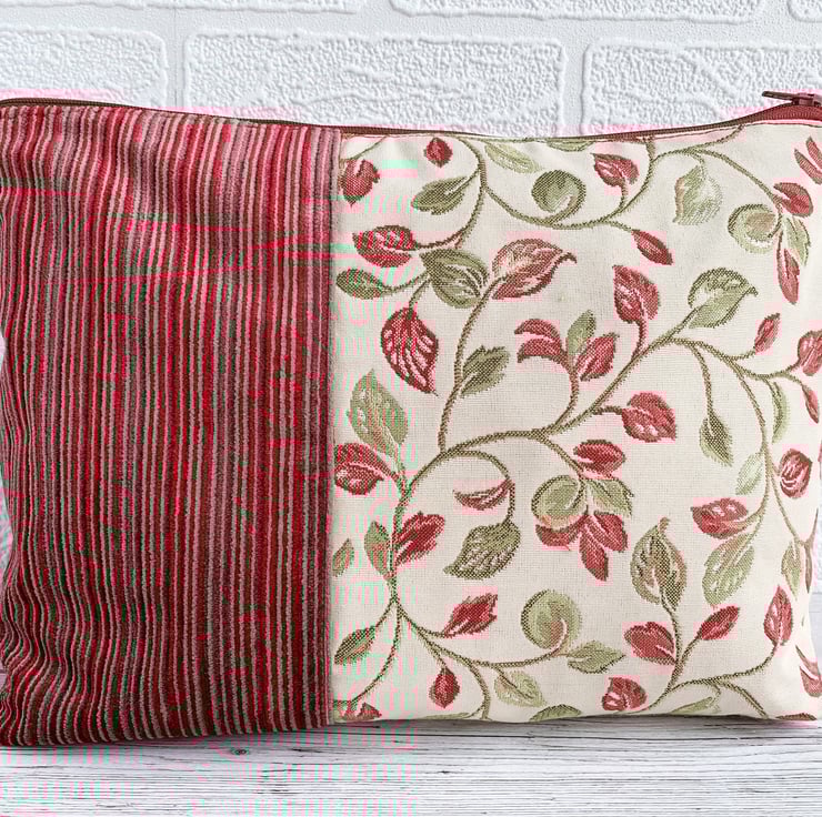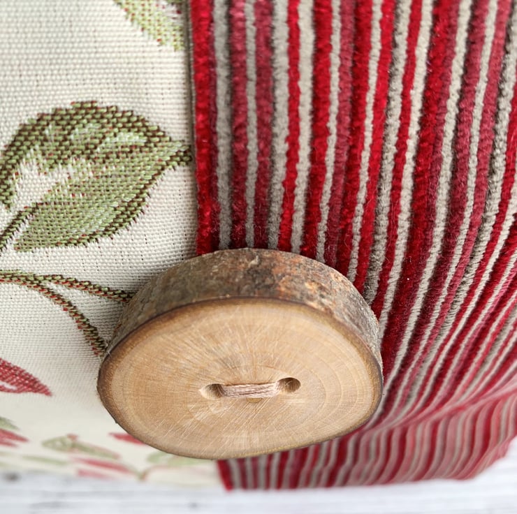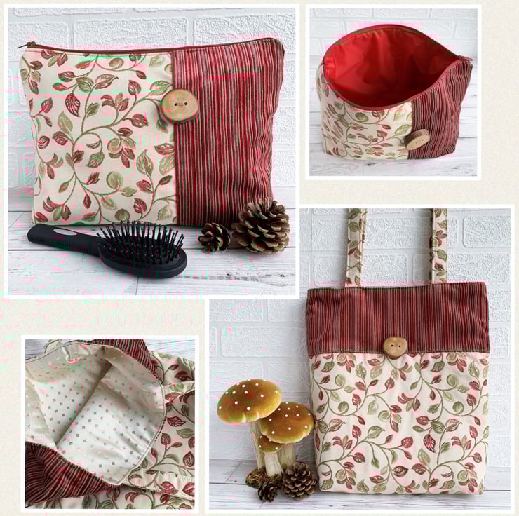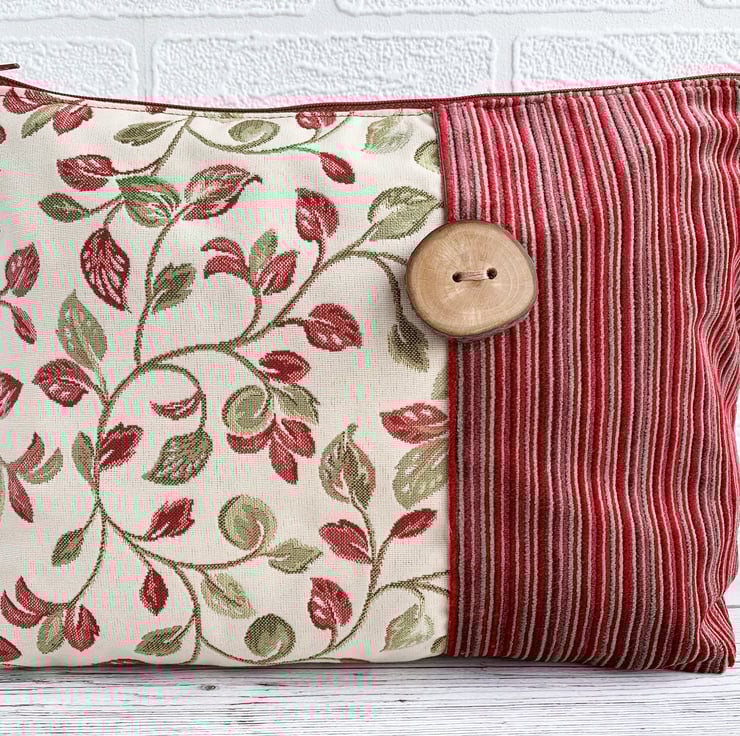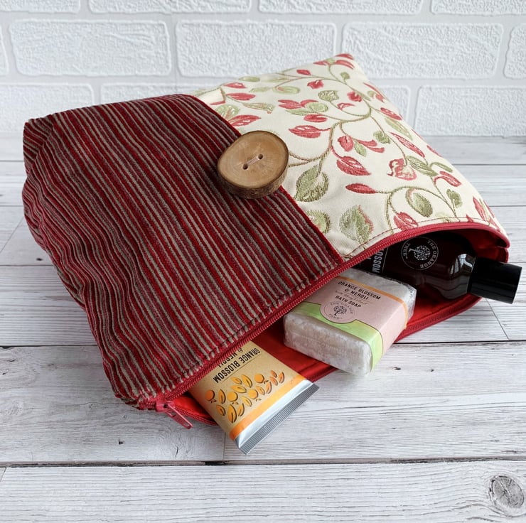 Woodland leaves toiletry bag. This woodland themed toiletry bag is made from two luxurious fabrics which complement each other beautifully. One fabric is cream with a lovely woven leafy pattern in shades of dark red and zesty green. The other fabric has luxurious textured velvety stripes in shades of red and beige. The two fabrics meet slightly off-centre with a top-stitched vertical seam. The back is a mirror image of the front. I've enhanced the woodland theme by adding to the front of the bag a gorgeous large handmade wooden button which still has the bark around the edge. The wash bag fastens with a dark red zip and is lined with red water-resistant fabric. The base of the bag is boxed giving plenty of space inside for lots of toiletries.