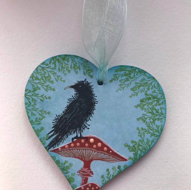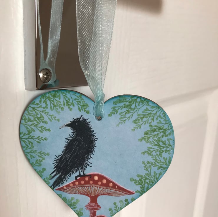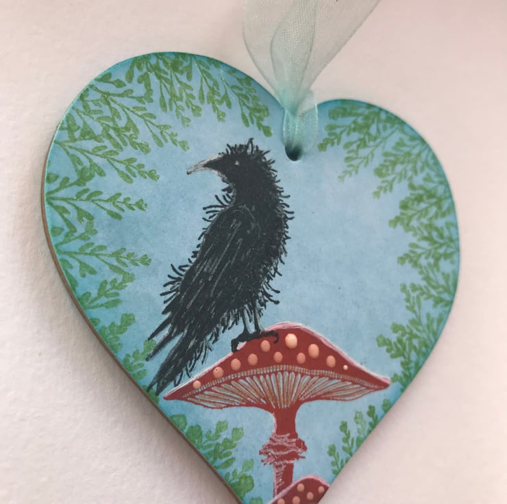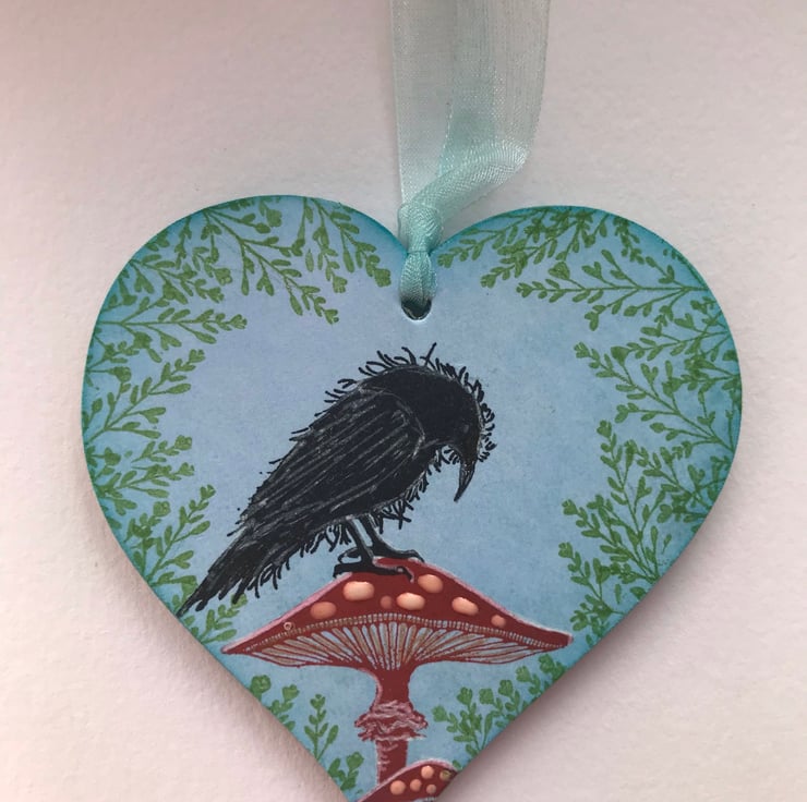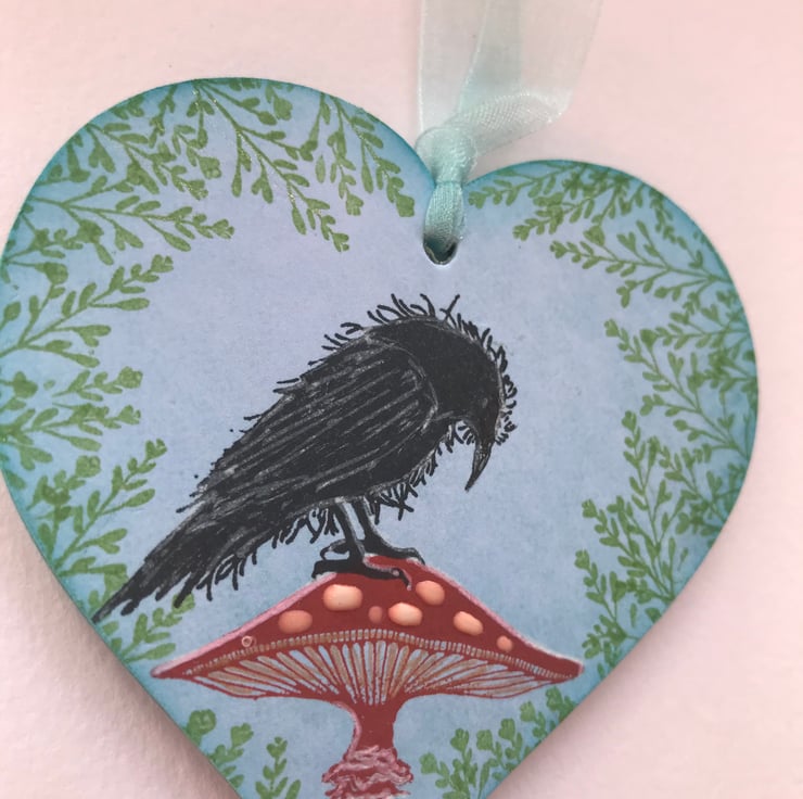 It has been covered in paper and stamped with a crow, mushrooms and ferns.
