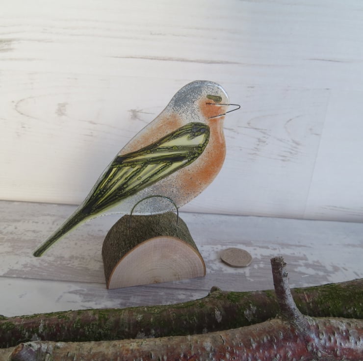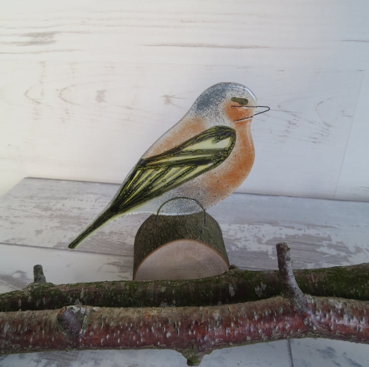 A glass Chaffinch standing on a log, He would be ideal sitting on a Conservatory windowsill with a view of the garden beyond.