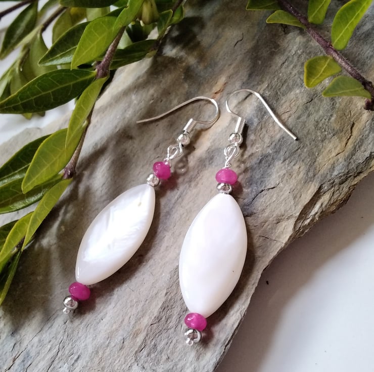 A beautiful pair of unique earrings designed and hand crafted using genuine natural mother of pearl complimented with 4mm faceted pink dyed quartzite rondelle gemstones. All other components used are quality silver plate to keep costs down making them more affordable to gift a unique gift or to treat yourself.