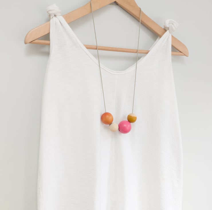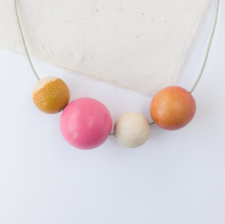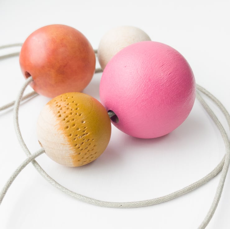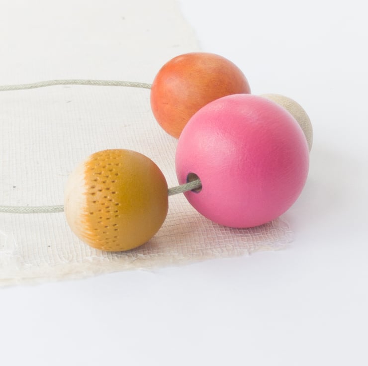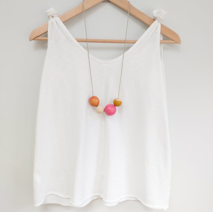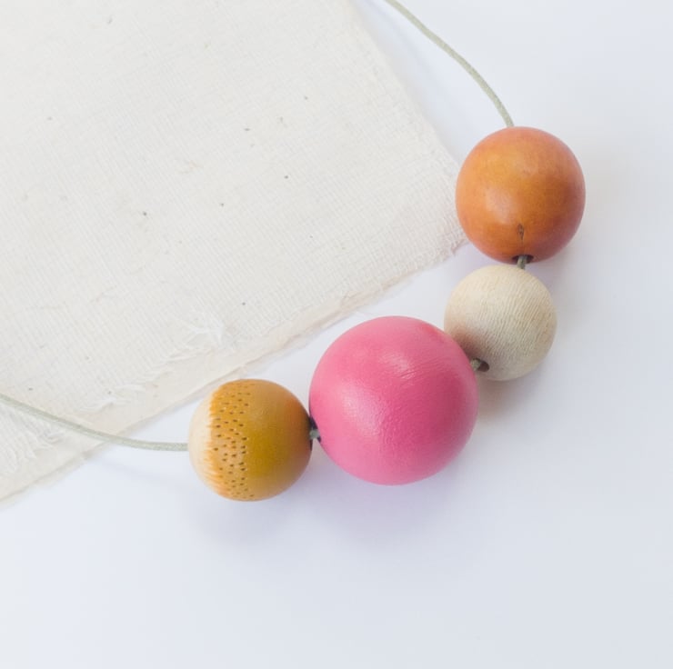 'Dolce' is a beaded necklace in hot pink, burnt orange, mustard, natural wood and white and is in the same series as 'Isla'. The orange bead is a seed and has a lovely mottled texture to it. The mustard bead has been hand painted and textured. It's one of my smaller necklaces, light and easy to wear.