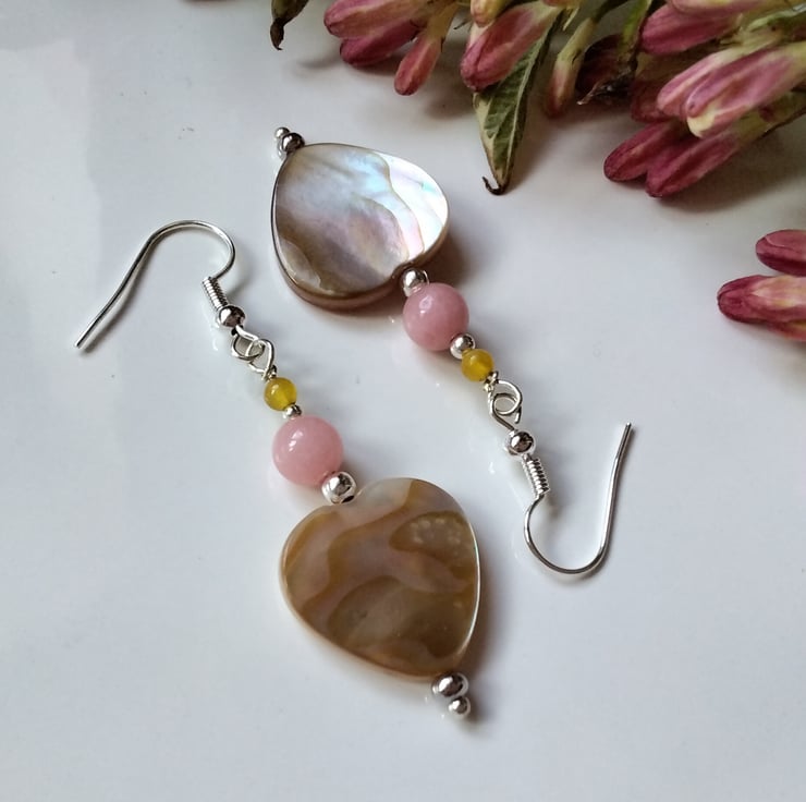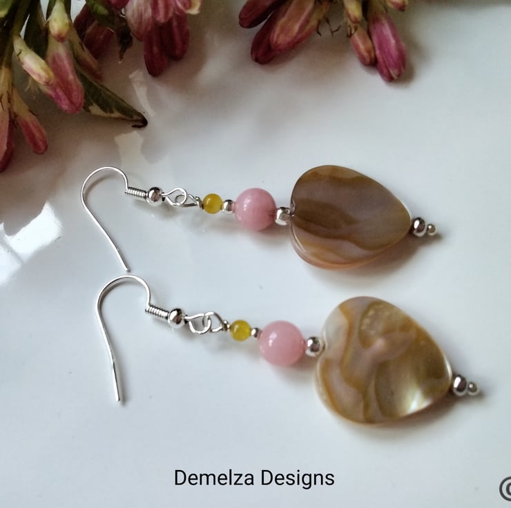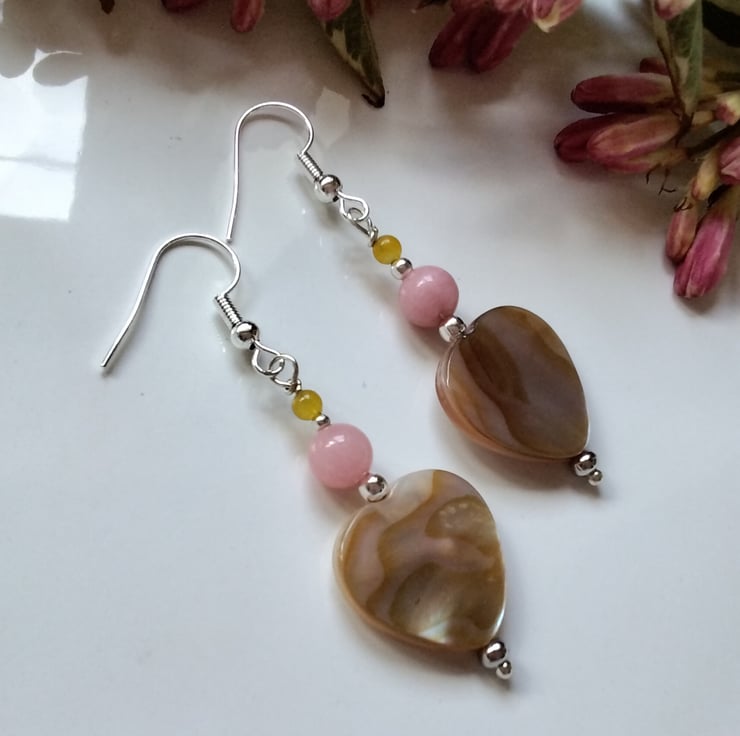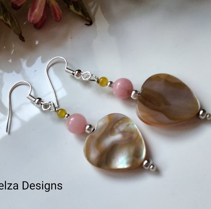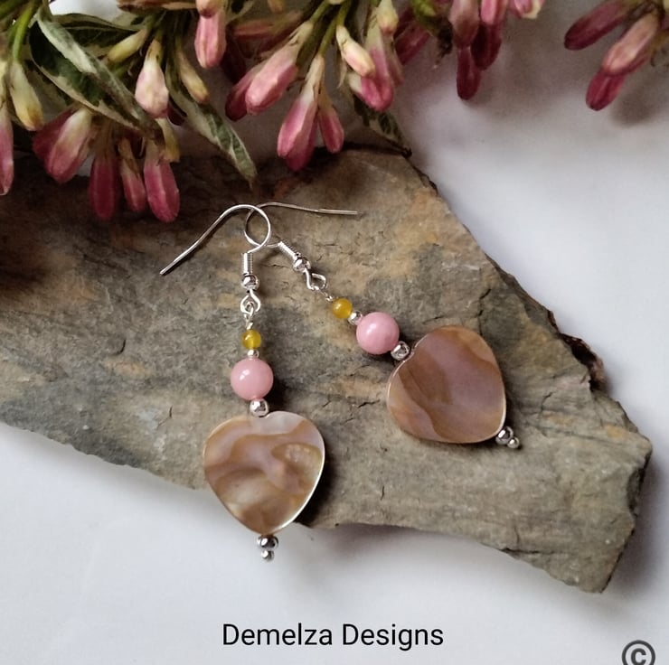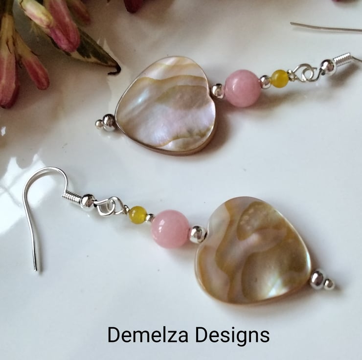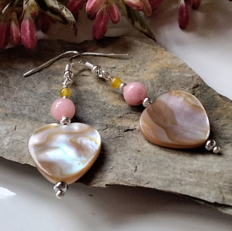 A beautiful pair of earrings designed and hand crafted using heart cut genuine natural mother of pearl complimented with 6mm peach and 3mm yellow dyed quartzite round gemstone beads. All other components used are quality silver plate to keep costs down making them more affordable without compromising on the quality gemstones used.
