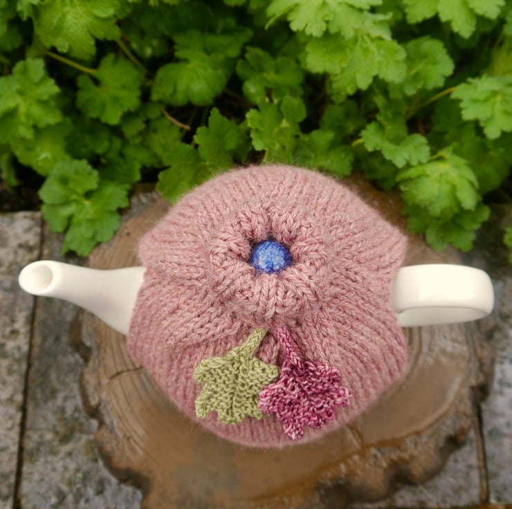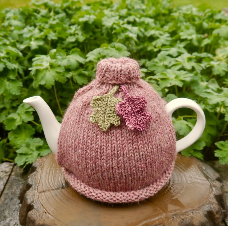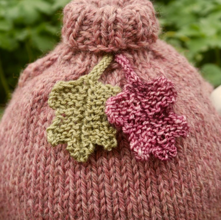 I have designed this cosy in a luxury alpaca and wool blend yarn in a warm pink colour way. There are two hand knitted oak leaves attached at the neck of the cosy. These are made using independently hand dyed sock yarn from indie dyers. One is knitted in green and and the other is a deep pink with lighter speckles.