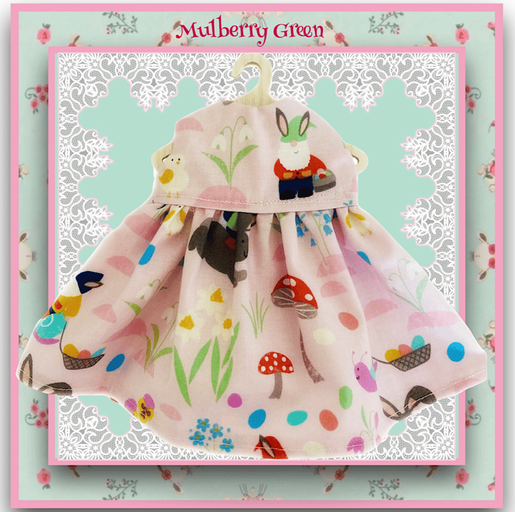 A pretty little pink dress in a gnomes and toadstools print to fit the Mulberry Green characters. The dress is made from best quality cotton, has a full skirt and a lined bodice.