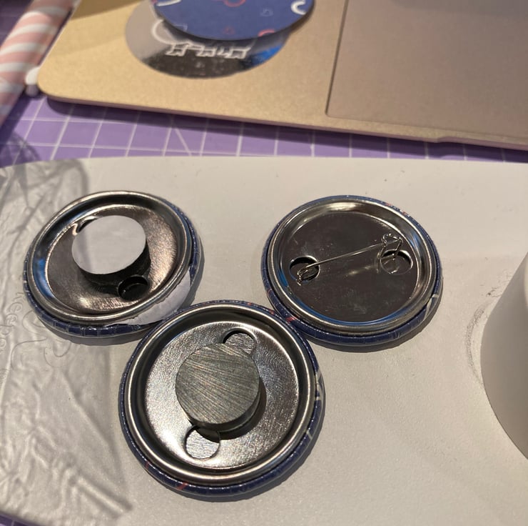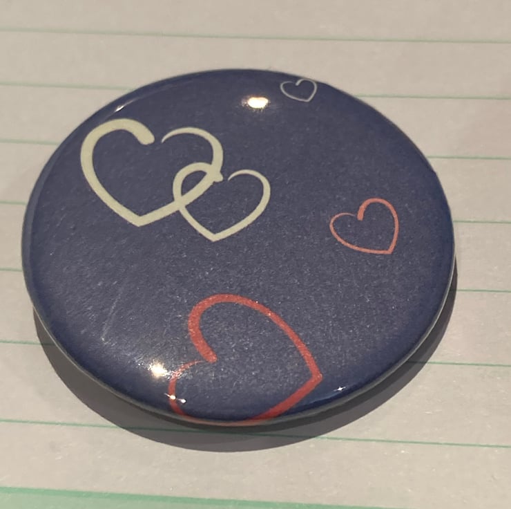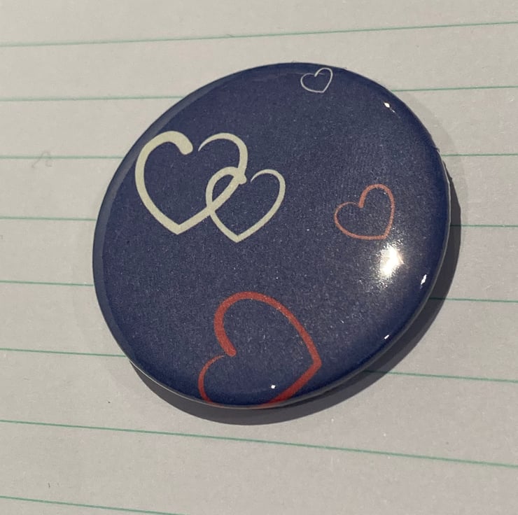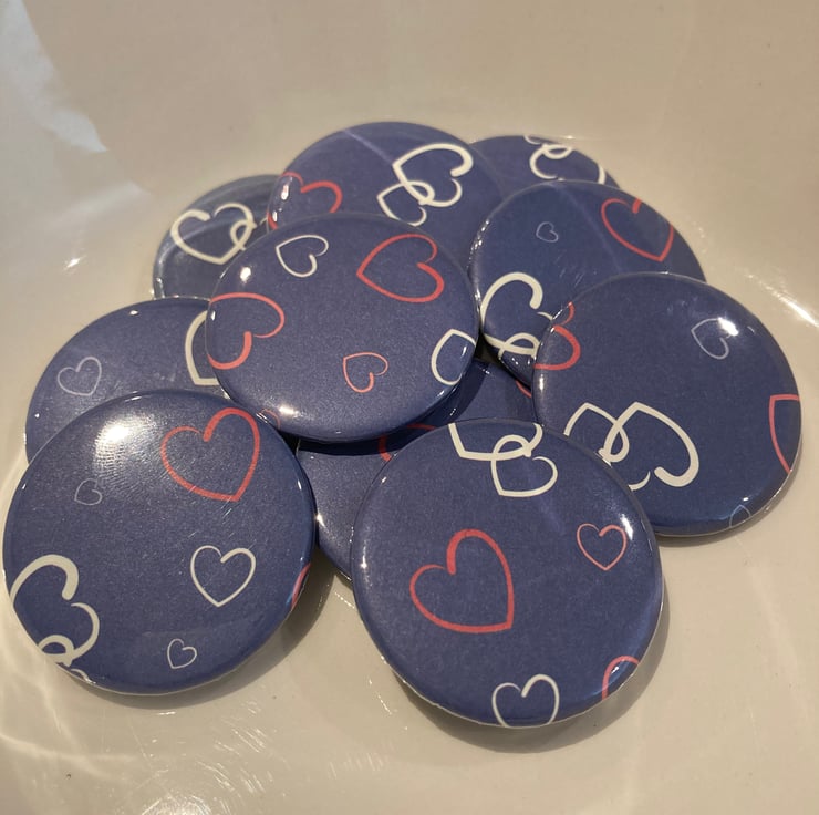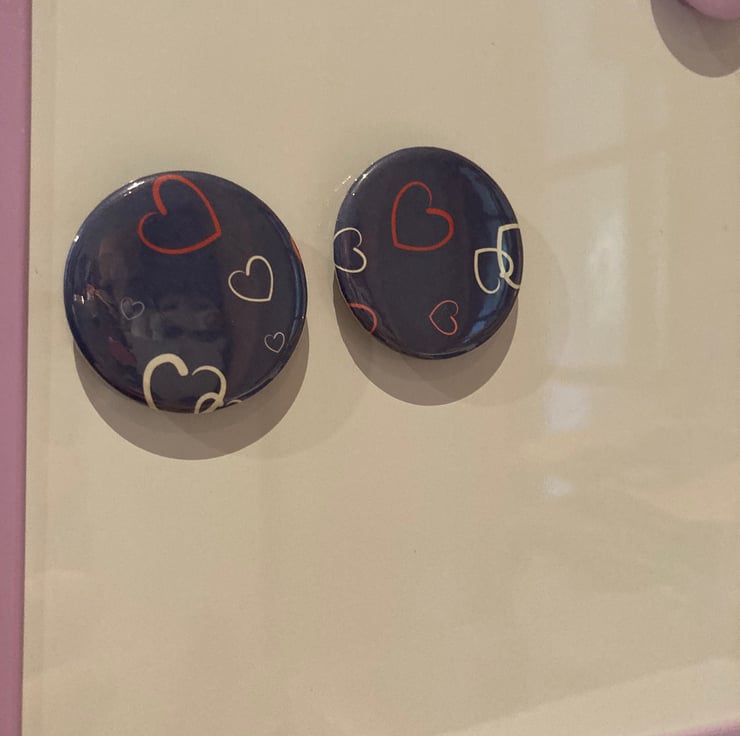 Hand made badges out of decorated heart paper some turned into magnets some into stickers the choice is yours