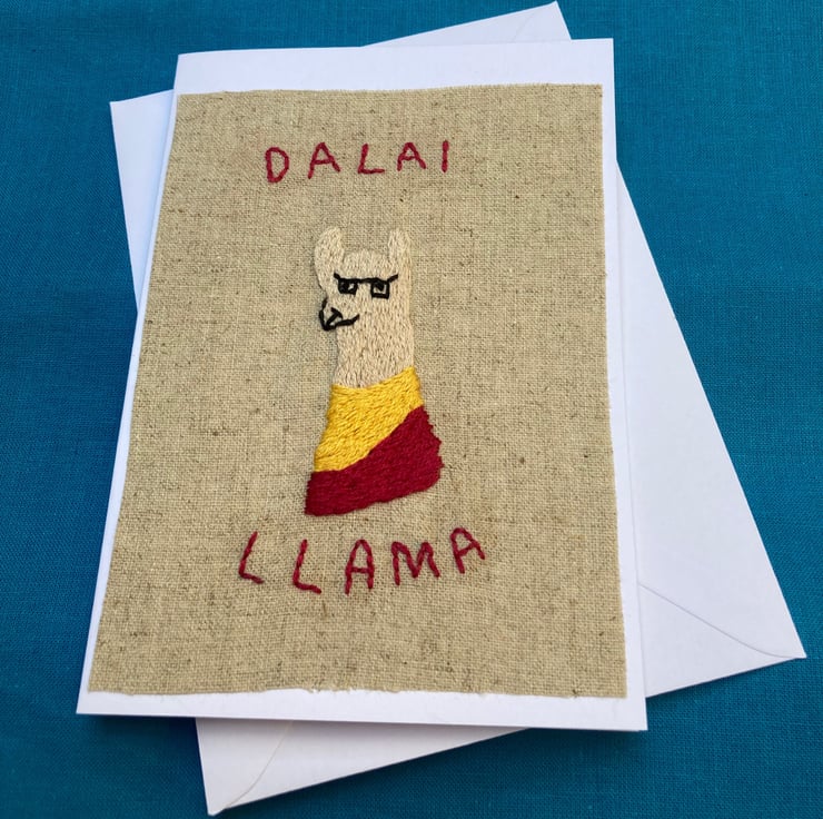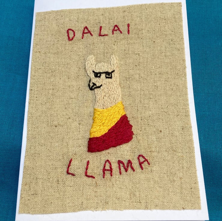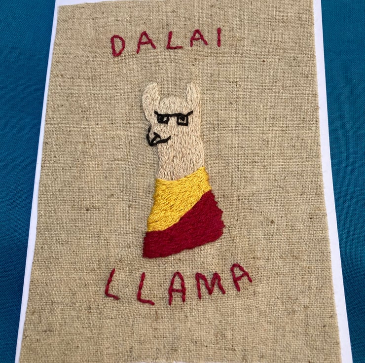 This wise "Dalai llama" has been hand embroidered onto rustic canvas and mounted on a white greetings card. The card is 4" x 6", comes with a matching envelope & has been left blank inside for your own message.