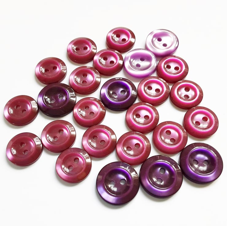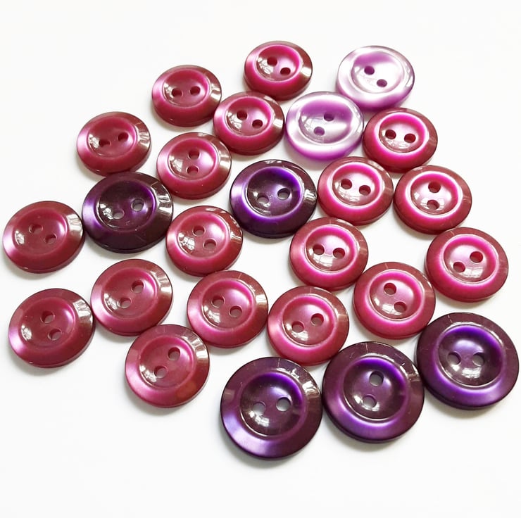 A mixed group of purple/plum buttons, in various shapes, colours and sizes.