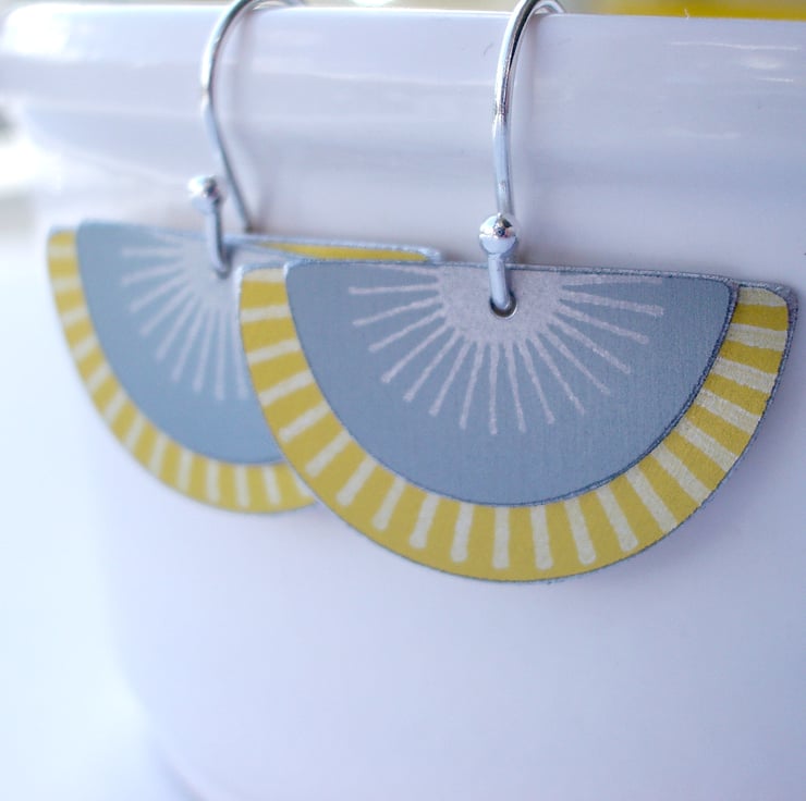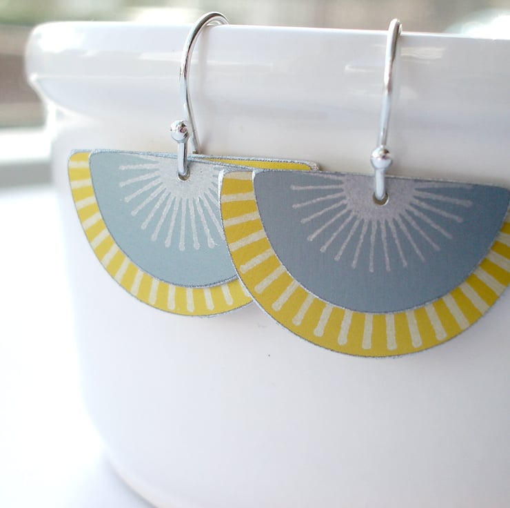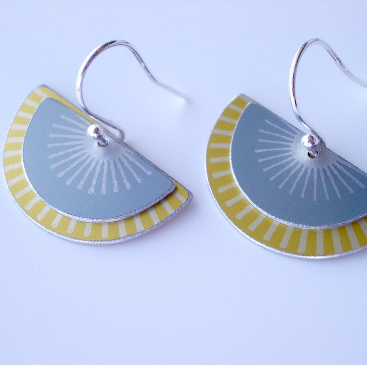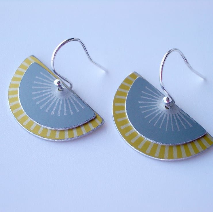 These striking fan shaped earrings are made from aluminium which I have dyed in grey and yellow and printed with a silver sunburst pattern. The dye is made permanent through heat and becomes part of the surface of the metal. I have saw pierced the two separate semi circles by hand and hung them on a sterling silver ear hook.