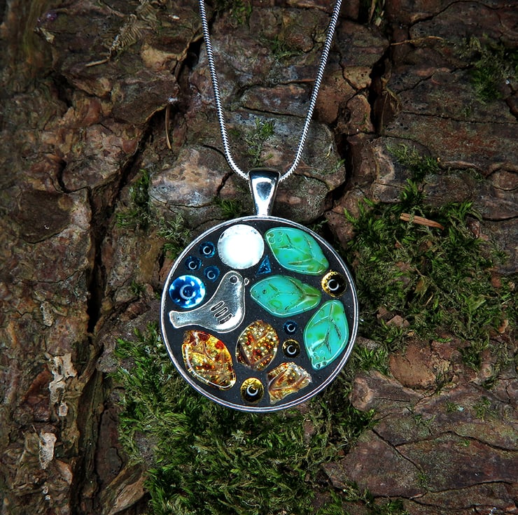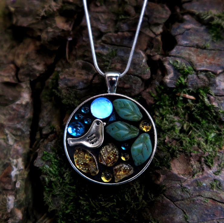 A pretty mosaic pendant featuring a tiny bird sitting on a flower next to a glow in the dark moon.