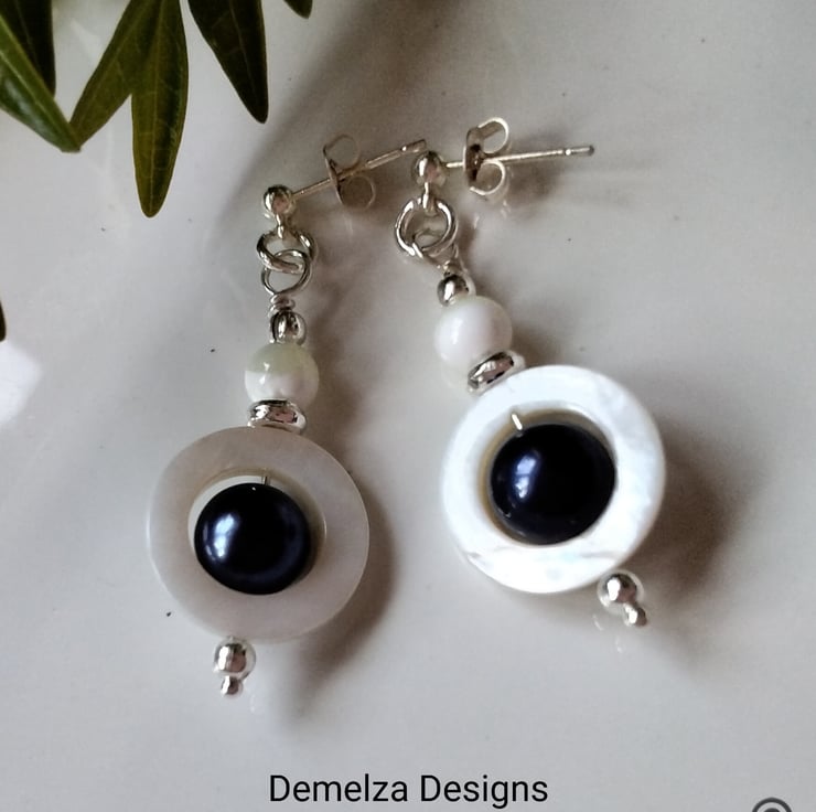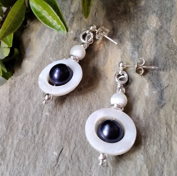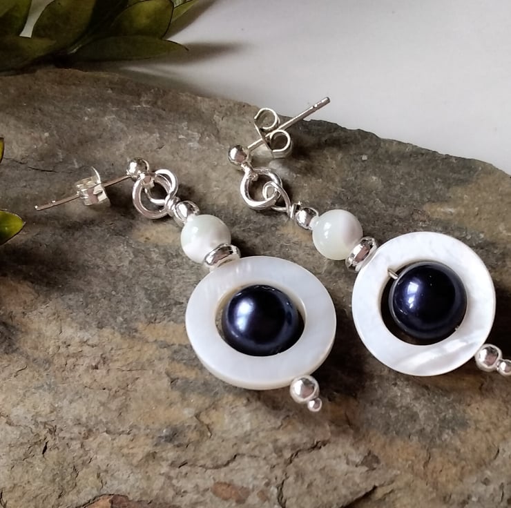 The 15mm coin cut mother of pearl have the centres cut out with 5mm royal blue shell pearls in the centre. To compliment them there are 6mm natural mother of pearl beads on top. All other components are quality silver plated.