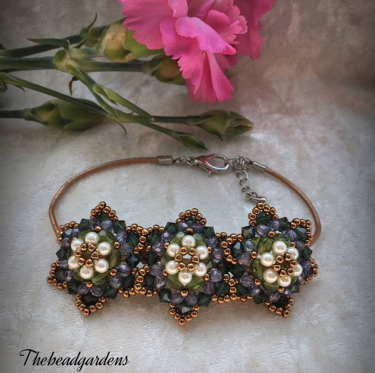 Three beaded flowers made with Swarovski crystals, Czech glass beads, pearl beads and seed beads.