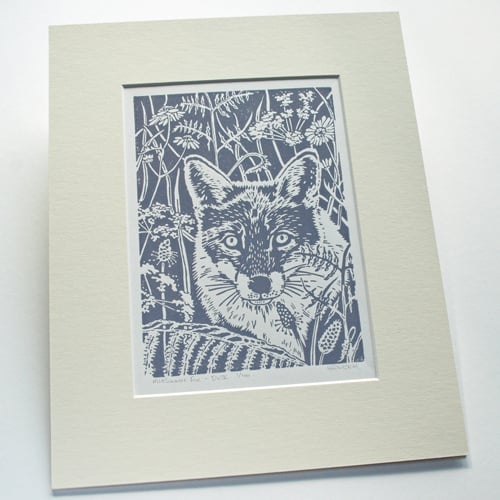 Fox at Dusk Limited Edition Linocut Print, titled Midsummer Fox - Dusk, printed on hand press in soft blue grey ink. Signed, editioned and titled in pencil by the artist.