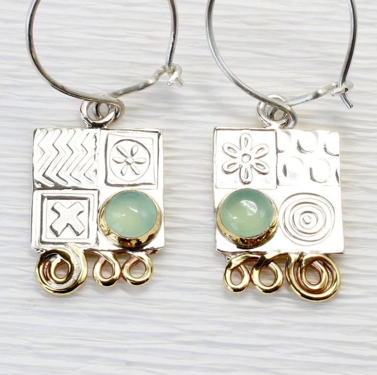 We designed and handmade these contemporary earrings in our workshop in Yorkshire. They are similar to our asymmetrical earrings but have matching stones and brass decoration. They are made from sterling silver, and this particular pair features two of our wonderful 6mm lab-grown Blue Opal triplet stones set in brass bezels. These opal earrings measure 25mm x 15mm and have a total drop length of 40mm. They hang on sterling silver earwires, which we also make.