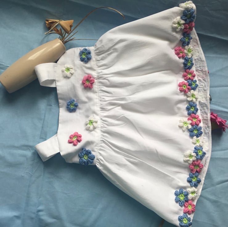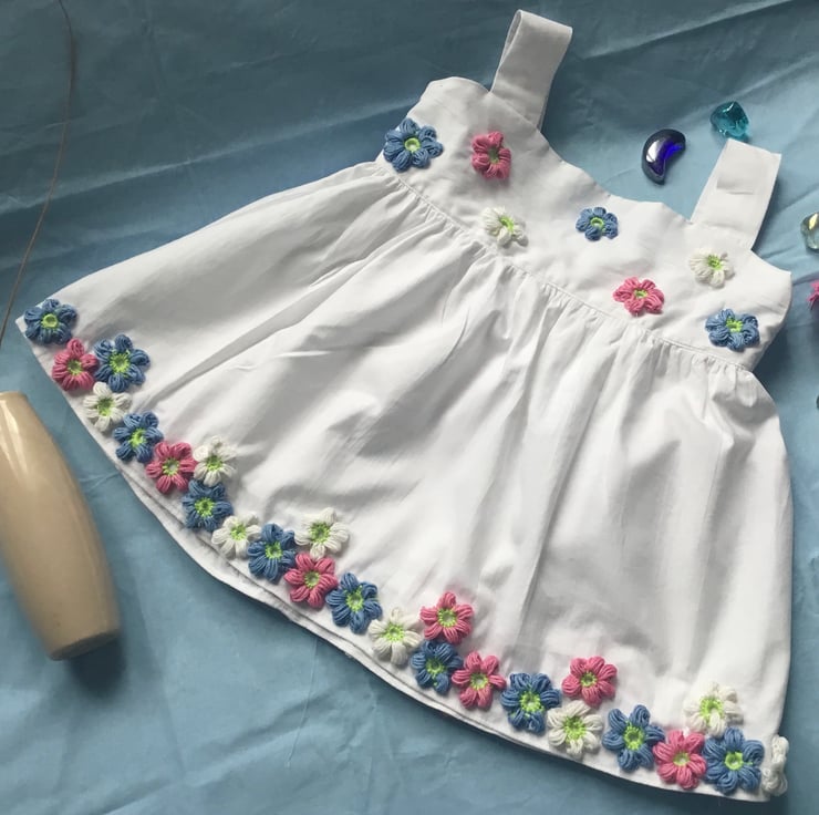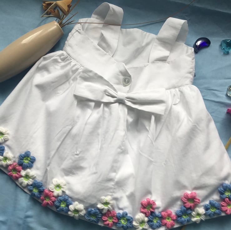 A white little dress with blue , white and pink flowers for embellishments , for 12 to 18 months, perfect for this season. It would be a wonderful present for those little princesses in your lives.