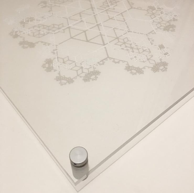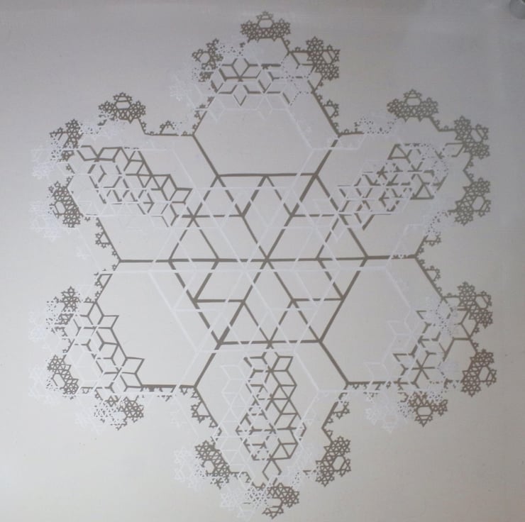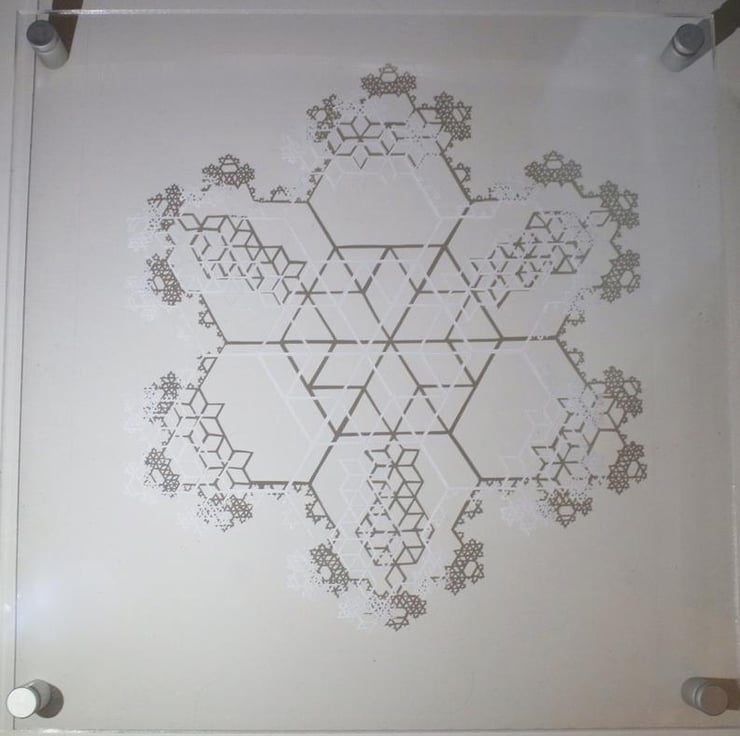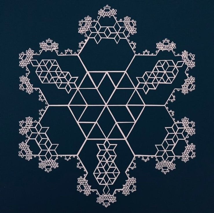 This is a paper cut of a Koch Snowflake. this is a fractal image produced with equilateral triangles. This has been carefully cut from 86g Awagami Masa paper. the paper cut has a diameter of 25cm.