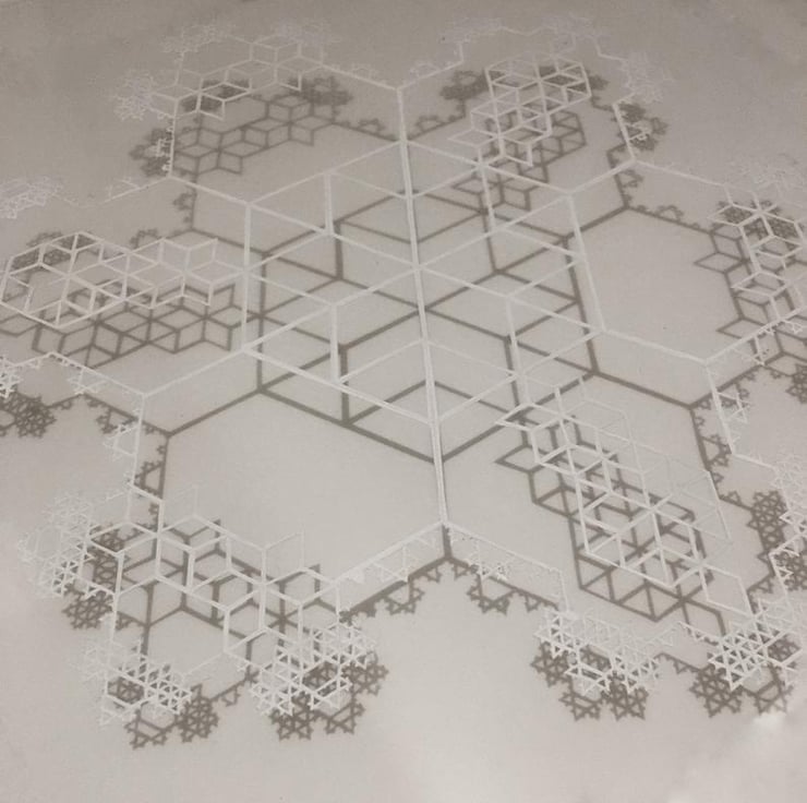 I like finding ways to make mathematics beautiful and looking at new and original ways of doing this. i have been fascinated with fractals and the seemingly simple image being repeated to produce an image of such complexity and beauty. This paper cut was cut from just an equilateral triangle.
