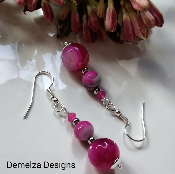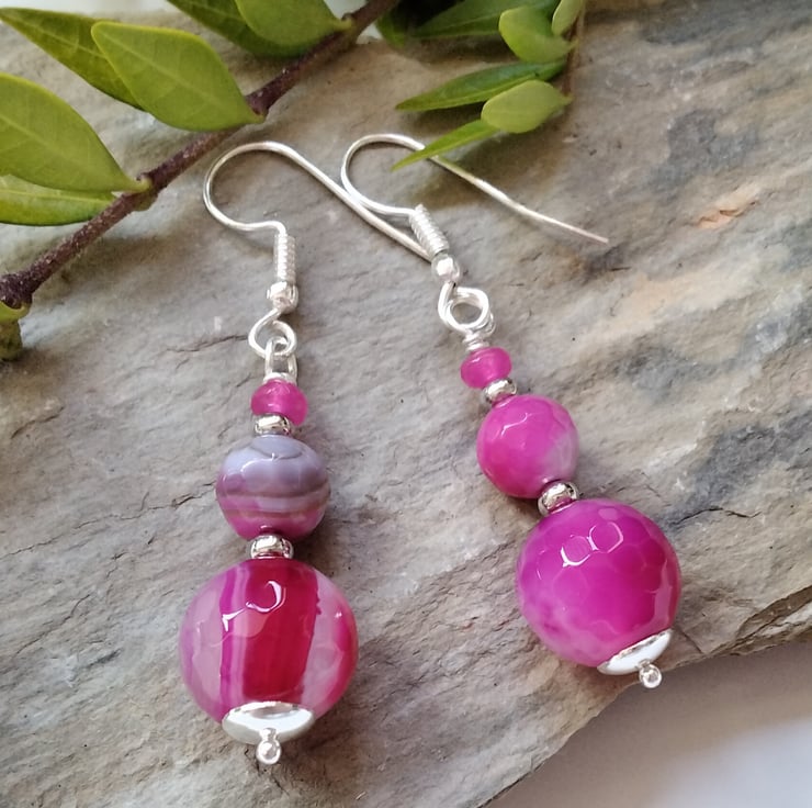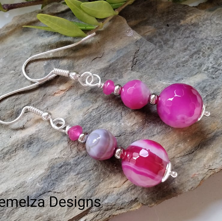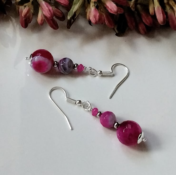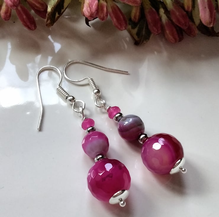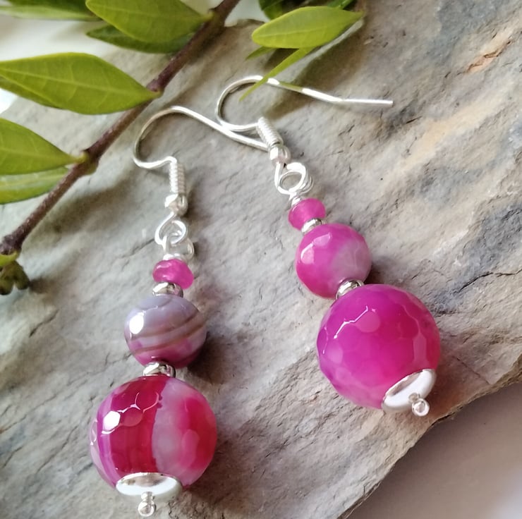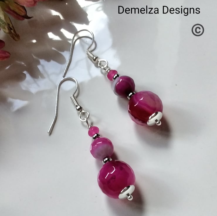 A bright vibrant pair of earrings designed and hand crafted using 15mm and 7mm pink infuser treated genuine faceted agate round gemstones complimented with 5mm hot pink infused treated faceted quartzite rondelle cut gemstones. All other components are quality silver plate keeping costs down without compromising on gemstone quality.