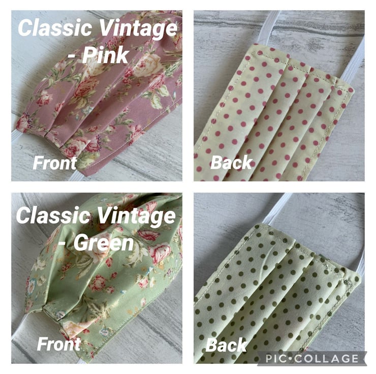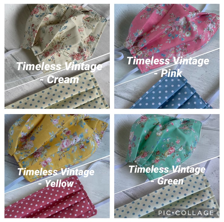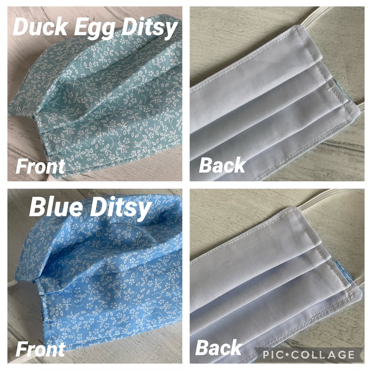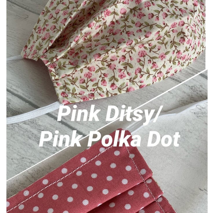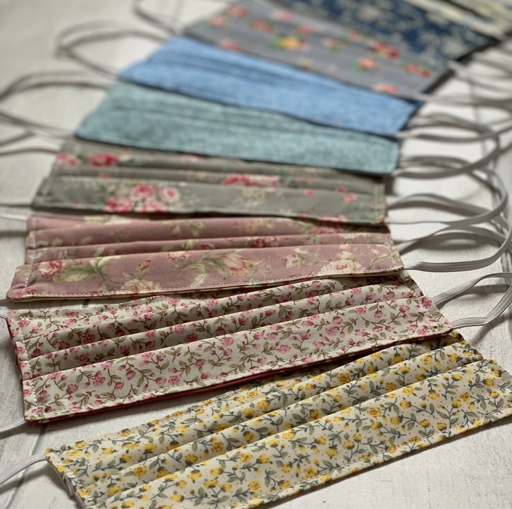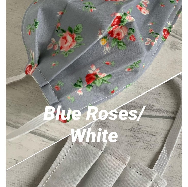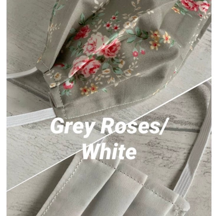 These pretty fabric hand sewn face masks are made using high quality fabrics. They have patterned fabric on the front and either plain cotton fabric on the reverse or a contrasting colour/design. They are fully washable and reusable and offer some protection whilst carrying out everyday tasks like shopping etc.