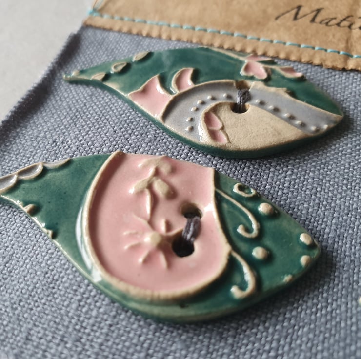 Set of Four Handmade Ceramic Buttons. These beautiful buttons have been handmade from Earthenware Clay. Before been embossed with the unique MatildaBelle Paisley Pattern giving a gentle raised design.