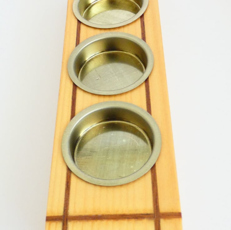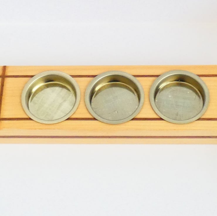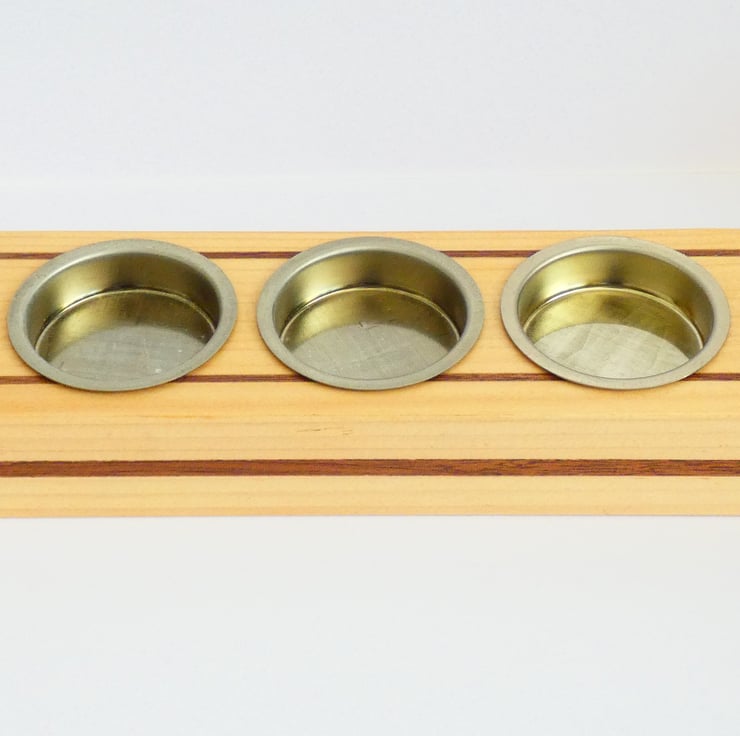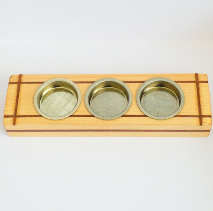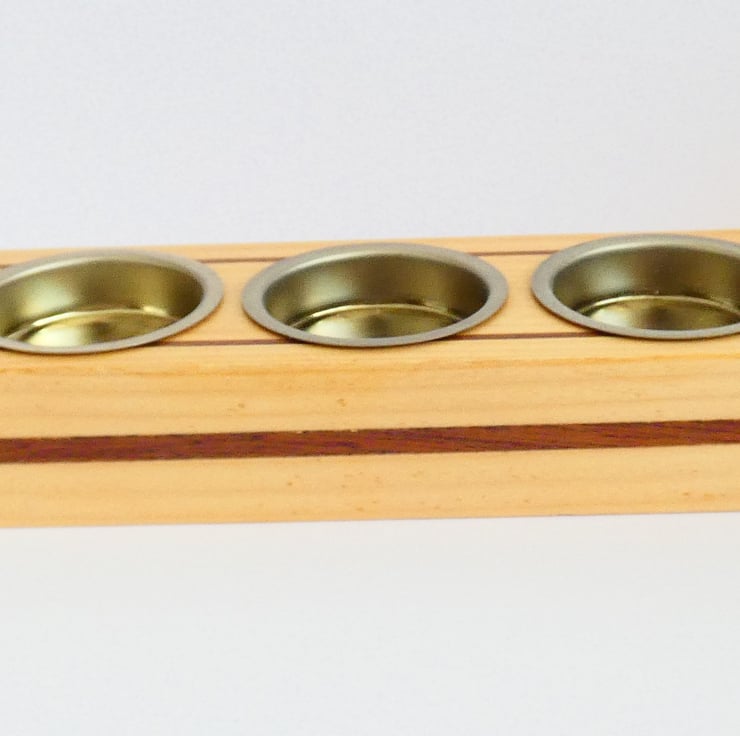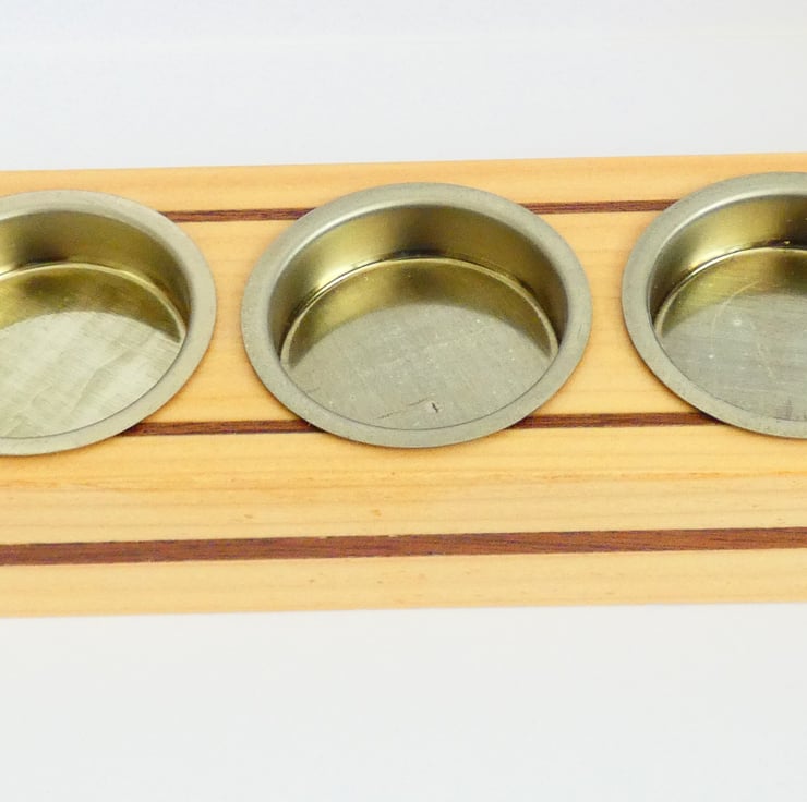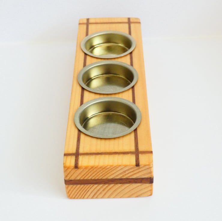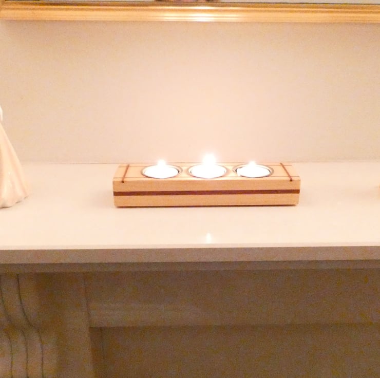 Pieces of recycled wood were cleaned and sanded to enable me to upcycle them. Grooves were cut into each candleholder, and inlays of Sapele were glued into place. The edges were then gently chamfered before being sanded to a smooth finish. They were covered with a coat of Shellac and fitted with brass candle holders, as recommended by Trading Standards.