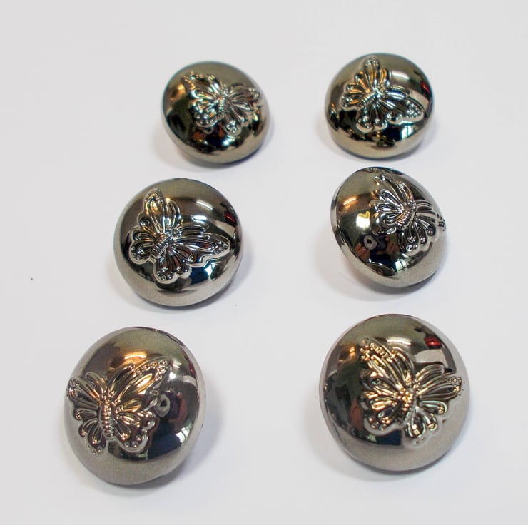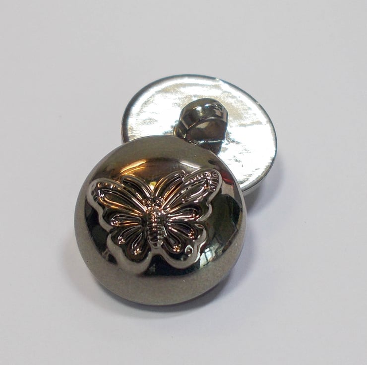 Pack of 6 gunmetal coloured faux metal butterfly dome shank buttons.